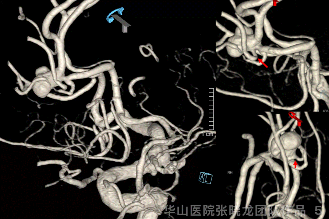 Figure 4 GIF. Rotational DSA confirmed a left A2/3 irregular aneurysm, a small anterior choroidal artery aneurysm and an ophthalmic aneurysm. The thick artery (arrow) was the left anterior choroidal artery instead of posterior communicating artery.