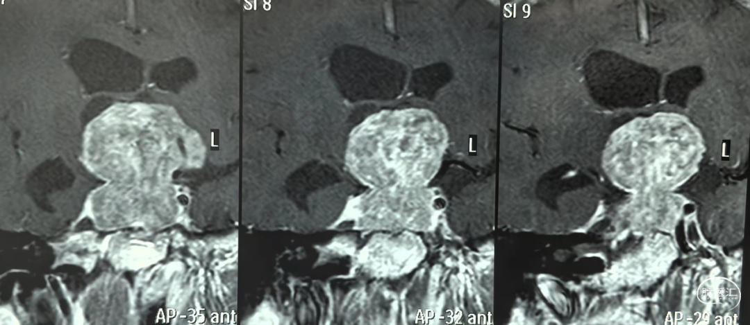 ■ MRI:鞍内鞍上巨大实性占位,强化明显,双侧颈内动脉及大脑前动脉部分包绕,考虑为垂体巨大腺瘤。