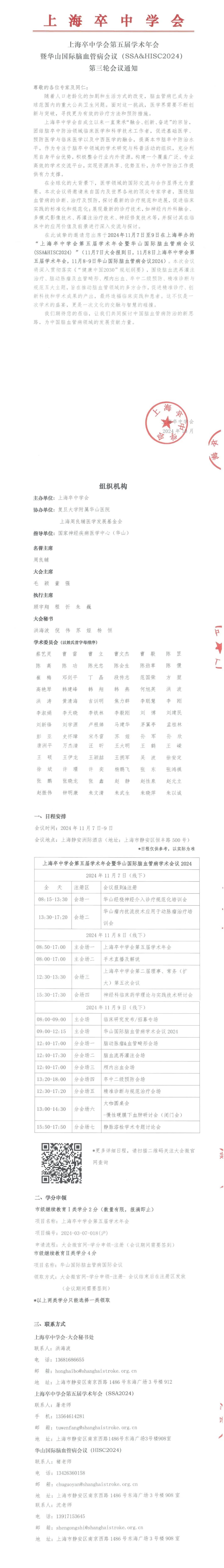 在此诚挚地邀请您出席于2024年11月7日至9日在上海举办的“上海卒中学会第五届学术年会暨华山国际脑血管病会议(SSA&HISC2024)”(11月7日大会报到日,11月8日上海卒中学会第五届学术年会,11月8-9日华山国际脑血管病会议2024)。本次会议将深入贯彻落实《“健康中国2030”规划纲要》,围绕再灌注治疗、脑动脉瘤及血管畸形、颅内出血、卒中二级预防、精准诊断与规范五大主题,旨在推动脑血管领域的多方合作,促进精准诊疗、创新科技和学术成果的产出,最终造福临床实践和患者。这不仅是一次学术的盛宴,更是一次文化的交融与智慧的碰撞。