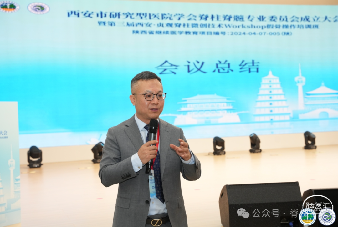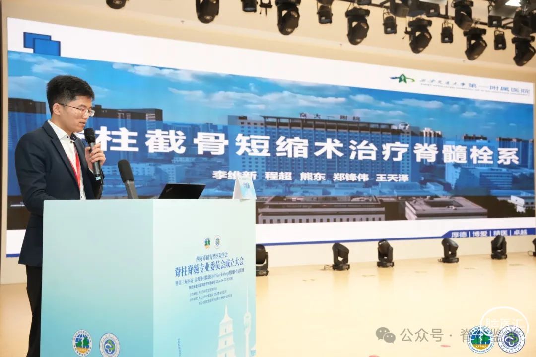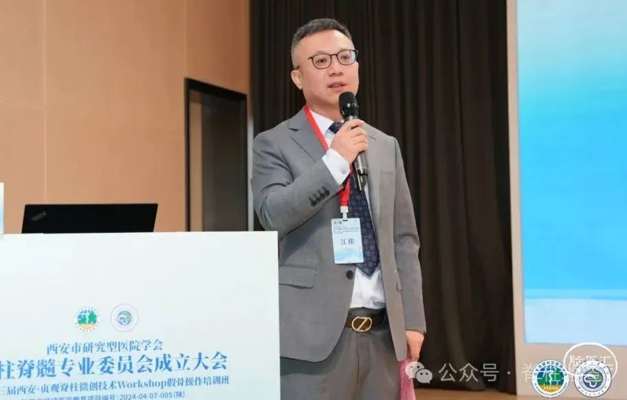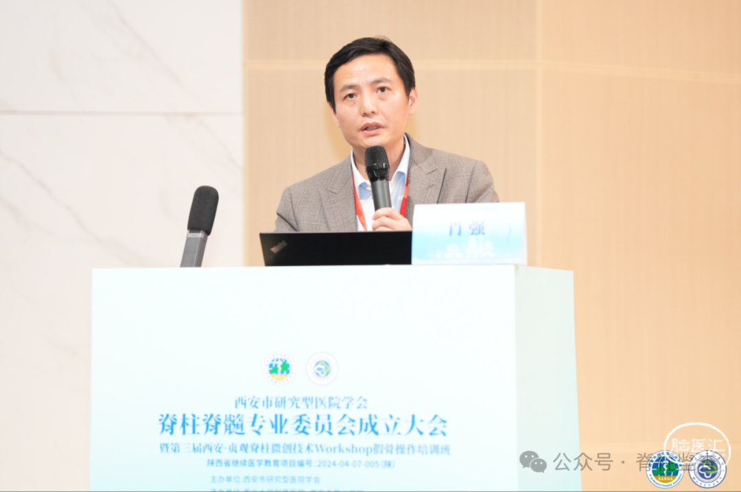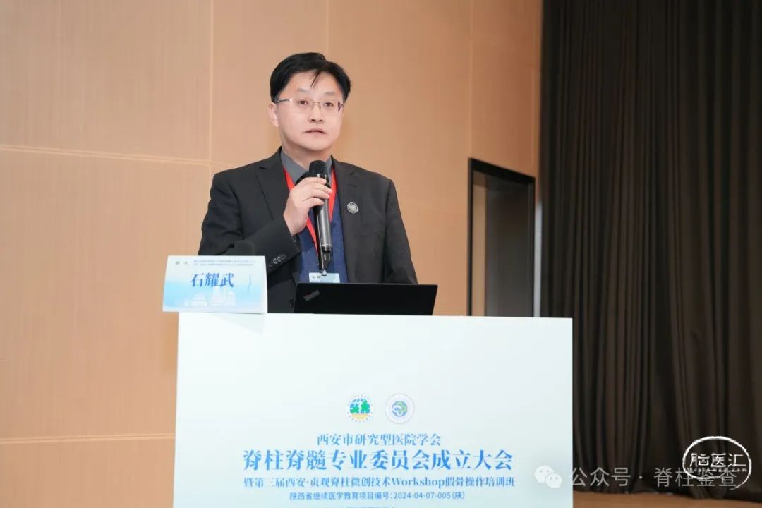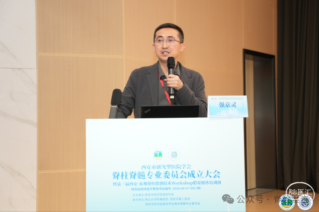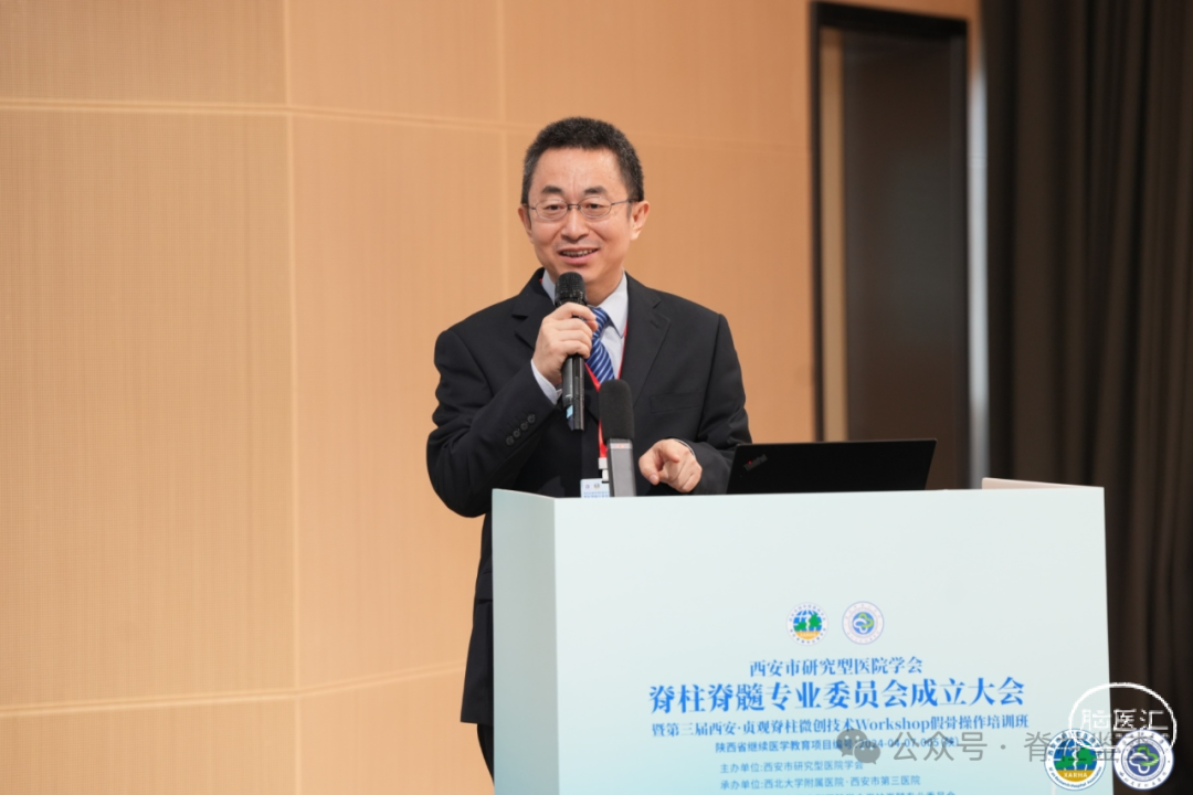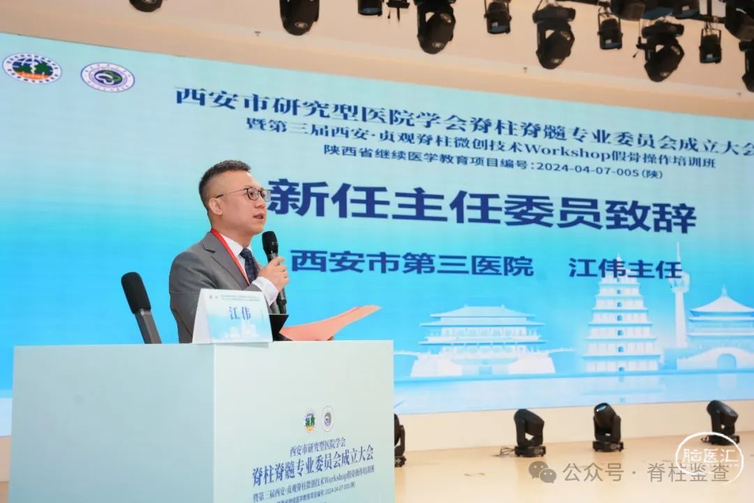 西安市研究型医院学会副会长钱露为脊柱脊髓专委会揭牌并致辞。钱露副会长对一直以来支持和关心脊柱脊髓医学的领导和嘉宾表示感谢,并介绍研究型医院学会的相关工作,同时对脊柱脊髓专业委员会工作提出相关要求。西北大学附属医院·西安市第三医院副院长石耀武代表医院致辞。石耀武副院长代表医院全体员工向远道而来专家、同道表示欢迎和感谢,向脊柱脊髓专业委员会成立表示祝贺;同时希望专委会充分发挥作用,提高脊柱脊髓疾病诊疗水平,造福患者。西北大学附属医院·西安市第三医院脊柱外科江伟教授当选首任主任委员,并表态:专委会将搭建一个交流学习、合作共进的平台,同时强调了今后将从学术交流、人才培养等四方面开展工作,共同促进脊柱脊髓疾病诊疗水平提升,服务患者。同时,西北大学附属医院·西安市第三医院还被中国椎间盘纤维环中心授牌为椎间盘内镜修复多中心研究课题单位。学术会议中,来自国内和省内的专家们就“上颈椎疾病、椎管狭窄、椎管内肿瘤治疗”“脊柱疾病荟萃”“脊柱微创技术”和“脊柱疾病鉴别、康复、病例讨论”四个章节分别分享。首都医科大学宣武医院陈赞教授分享《PFDF技术治疗寰枢椎脱位专家共识2024解读》。首都医科大学附属北京天坛医院贾文清教授分享《脊髓海绵状血管畸形的治疗策略》。首都医科大学三博脑科医院范涛教授分享《颅底凹陷的分型及手术治疗》。解放军总医院第四医学中心任东风教授分享《腰椎管狭窄的治疗方式演变及思考》。西安交通大学第二附属医院李浩鹏教授分享《胸椎管狭窄治疗的策略及关键技术》。四川省人民医院刘进平教授分享《寰枢椎脱位的外科治疗策略》。西安交通大学第一附属医院王宁教授分享《小脑扁桃体下疝畸形的外科治疗》。西北大学附属医院·西安市第三医院江伟教授分享《颅颈交界区脊膜瘤手术治疗体会》。南昌大学第一附属医院张斌教授分享《椎体成形术后责任椎体感染原因分析及治疗策》。西安交通大学第一附属医院李维新教授(程超替发言)分享《腰椎短缩治疗难治性脊髓拴系》。西北大学附属医院·西安市第三医院张格娟教授分享《神经内科与脊柱外科常见疾病的鉴别诊断》。空军军医大学唐都医院王鹏教授分享《骶尾部肿瘤的手术治疗策略体会》。张家港市第一人民医院张立教授分享《垂头综合征的诊断和治疗》。首都医科大学宣武医院王凯教授分享《微创治疗退变性脊柱侧弯》。复旦大学附属闵行医院江晔教授分享《经皮穿刺脊柱内镜处理颈椎病的治疗策略》。江西省人民医院肖强教授分享《颈椎后路全内镜技术治疗神经根型颈椎病》。西安交通大学第一附属医院杜恒教授分享《脊柱内镜下腰椎髓核摘除术联合纤维环缝合术的临床运用及多中心RCT临床试验》。西宁市第一人民医院关炳瑜教授分享《单轴脊柱内镜下融合技术的体会》。宁夏固原市原州区人民医院万欣龙教授分享《微通道显微镜下手术治疗腰椎管狭窄的体会》。西安国际医学中心医院卫建民教授分享《单通道内镜临床应用的边界与思考》。西安市红会医院杨俊松教授分享《Find the key and dig the hole:快速玩转颈椎后路内镜keyhole减压》。西安交通大学第二附属医院李锋涛教授分享《AUSS技术在脊柱退行性疾病中的应用》。兵器工业总医院刘少军教授分享《UBE在神经根型颈椎病中的应用》。陕西中医药大学附属骨伤医院赵胜杰教授分享《生理性逻辑等运动疗法在脊柱相关疾病康复中的应用体会》。延安大学附属医院强京灵教授分享《颈椎前路术后并发症病例讨论》。西安交通大学第一附属医院程超教授分享《脊髓电刺激SCS治疗下肢缺血性病变临床体会》。西北大学附属医院·西安市第三医院左威主治医师分享《胸腰椎骨质疏松骨折的分型及手术策略》。西北大学附属医院·西安市第三医院杜占主治医师分享《超声骨刀在脊柱脊髓手术中的应用体会》。江伟教授在会议总结中再次表达对各级领导和国内、省内专家学者的支持表示感谢,并强调“脊柱脊髓,大有可为”今后专委会将定期举行培训班、沙龙、技术帮扶等培养脊柱微创技术专业人才、提升脊柱微创技术,造福脊柱疾病患者!