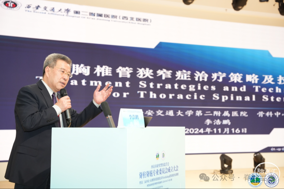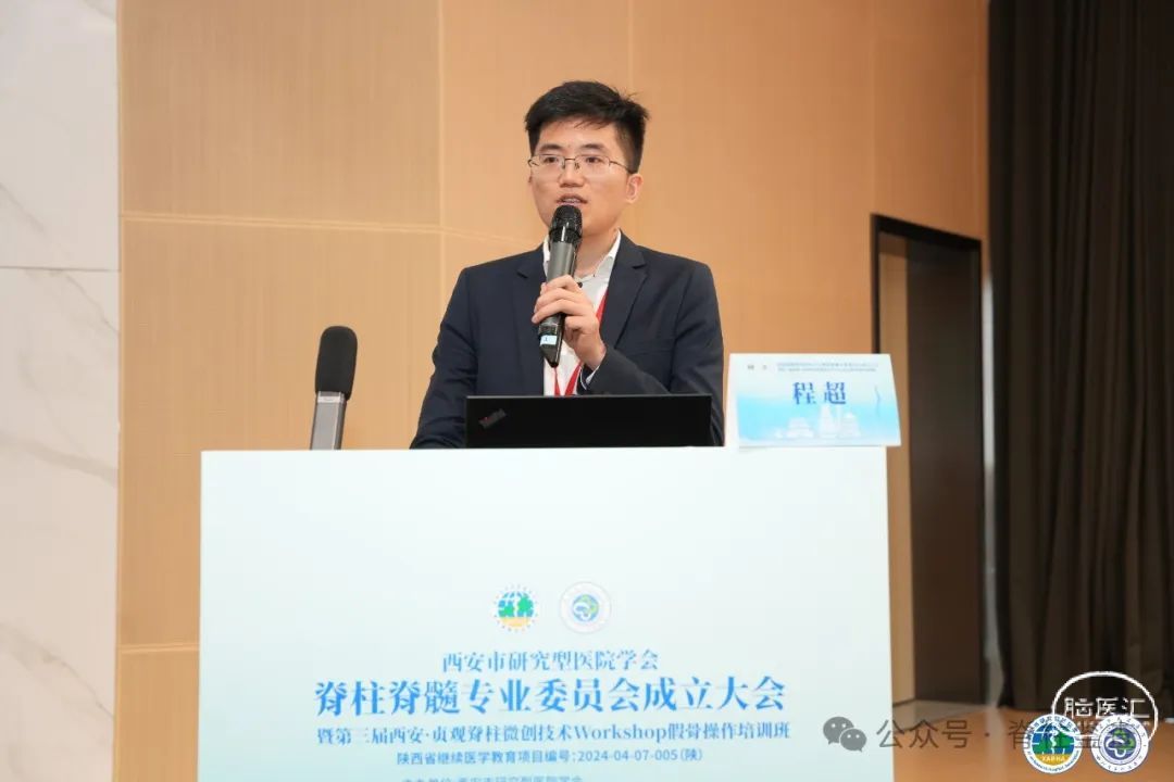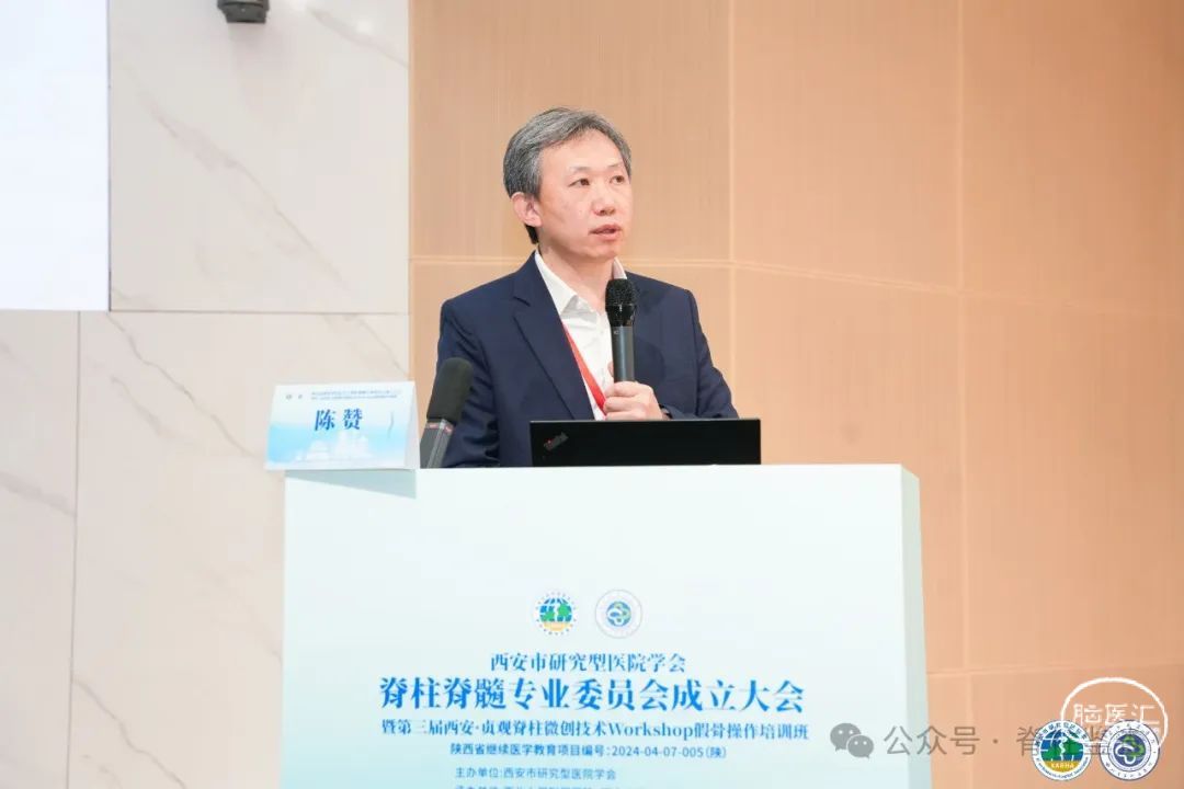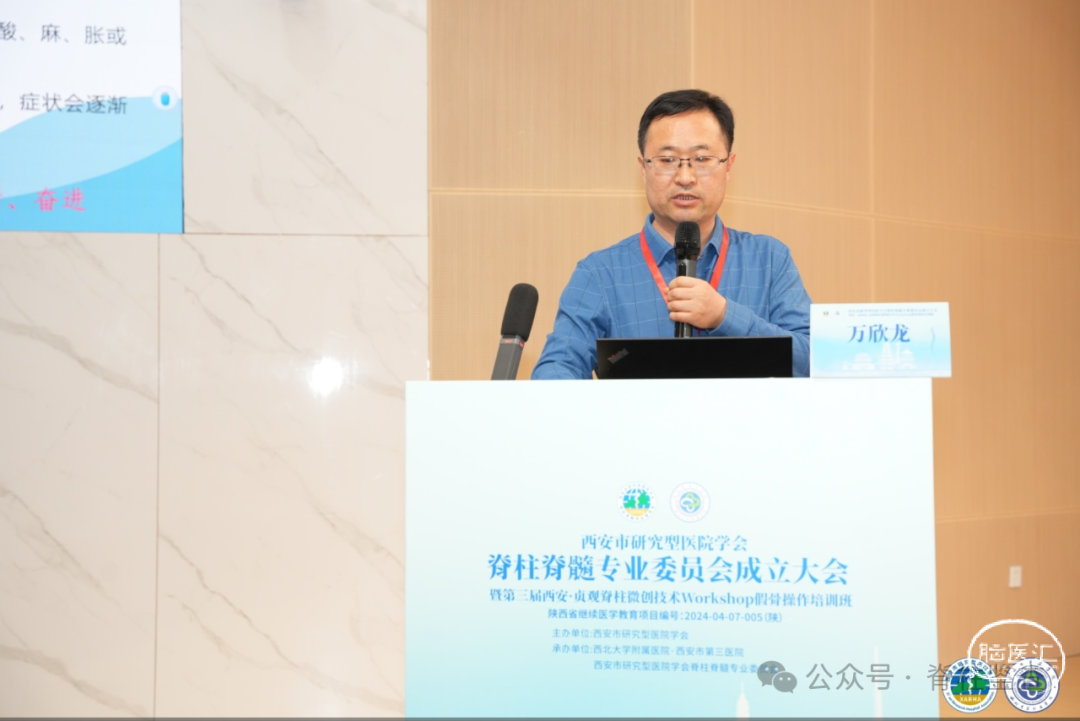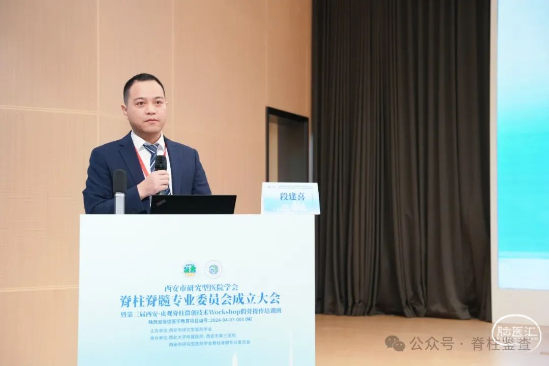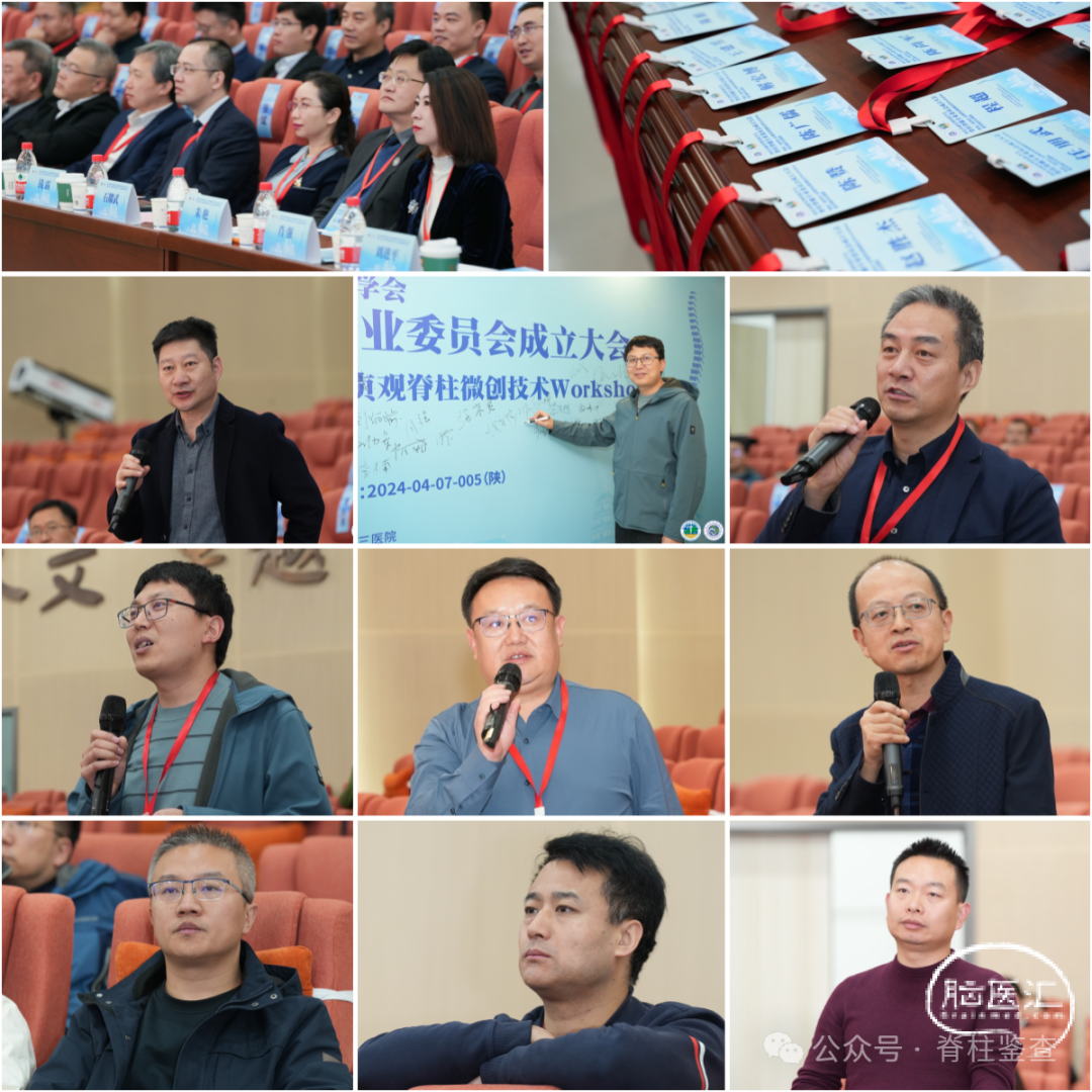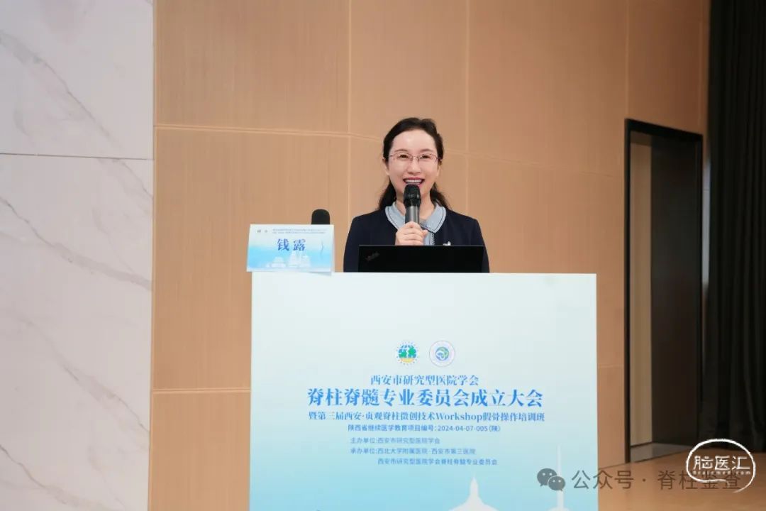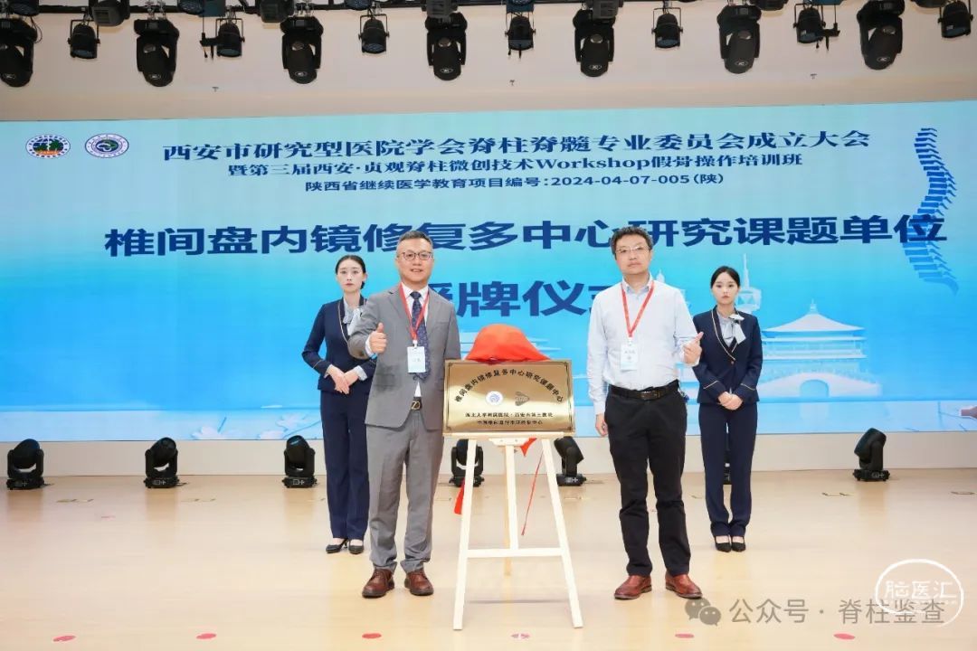 西安市研究型医院学会副会长钱露为脊柱脊髓专委会揭牌并致辞。钱露副会长对一直以来支持和关心脊柱脊髓医学的领导和嘉宾表示感谢,并介绍研究型医院学会的相关工作,同时对脊柱脊髓专业委员会工作提出相关要求。西北大学附属医院·西安市第三医院副院长石耀武代表医院致辞。石耀武副院长代表医院全体员工向远道而来专家、同道表示欢迎和感谢,向脊柱脊髓专业委员会成立表示祝贺;同时希望专委会充分发挥作用,提高脊柱脊髓疾病诊疗水平,造福患者。西北大学附属医院·西安市第三医院脊柱外科江伟教授当选首任主任委员,并表态:专委会将搭建一个交流学习、合作共进的平台,同时强调了今后将从学术交流、人才培养等四方面开展工作,共同促进脊柱脊髓疾病诊疗水平提升,服务患者。同时,西北大学附属医院·西安市第三医院还被中国椎间盘纤维环中心授牌为椎间盘内镜修复多中心研究课题单位。学术会议中,来自国内和省内的专家们就“上颈椎疾病、椎管狭窄、椎管内肿瘤治疗”“脊柱疾病荟萃”“脊柱微创技术”和“脊柱疾病鉴别、康复、病例讨论”四个章节分别分享。首都医科大学宣武医院陈赞教授分享《PFDF技术治疗寰枢椎脱位专家共识2024解读》。首都医科大学附属北京天坛医院贾文清教授分享《脊髓海绵状血管畸形的治疗策略》。首都医科大学三博脑科医院范涛教授分享《颅底凹陷的分型及手术治疗》。解放军总医院第四医学中心任东风教授分享《腰椎管狭窄的治疗方式演变及思考》。西安交通大学第二附属医院李浩鹏教授分享《胸椎管狭窄治疗的策略及关键技术》。四川省人民医院刘进平教授分享《寰枢椎脱位的外科治疗策略》。西安交通大学第一附属医院王宁教授分享《小脑扁桃体下疝畸形的外科治疗》。西北大学附属医院·西安市第三医院江伟教授分享《颅颈交界区脊膜瘤手术治疗体会》。南昌大学第一附属医院张斌教授分享《椎体成形术后责任椎体感染原因分析及治疗策》。西安交通大学第一附属医院李维新教授(程超替发言)分享《腰椎短缩治疗难治性脊髓拴系》。西北大学附属医院·西安市第三医院张格娟教授分享《神经内科与脊柱外科常见疾病的鉴别诊断》。空军军医大学唐都医院王鹏教授分享《骶尾部肿瘤的手术治疗策略体会》。张家港市第一人民医院张立教授分享《垂头综合征的诊断和治疗》。首都医科大学宣武医院王凯教授分享《微创治疗退变性脊柱侧弯》。复旦大学附属闵行医院江晔教授分享《经皮穿刺脊柱内镜处理颈椎病的治疗策略》。江西省人民医院肖强教授分享《颈椎后路全内镜技术治疗神经根型颈椎病》。西安交通大学第一附属医院杜恒教授分享《脊柱内镜下腰椎髓核摘除术联合纤维环缝合术的临床运用及多中心RCT临床试验》。西宁市第一人民医院关炳瑜教授分享《单轴脊柱内镜下融合技术的体会》。宁夏固原市原州区人民医院万欣龙教授分享《微通道显微镜下手术治疗腰椎管狭窄的体会》。西安国际医学中心医院卫建民教授分享《单通道内镜临床应用的边界与思考》。西安市红会医院杨俊松教授分享《Find the key and dig the hole:快速玩转颈椎后路内镜keyhole减压》。西安交通大学第二附属医院李锋涛教授分享《AUSS技术在脊柱退行性疾病中的应用》。兵器工业总医院刘少军教授分享《UBE在神经根型颈椎病中的应用》。陕西中医药大学附属骨伤医院赵胜杰教授分享《生理性逻辑等运动疗法在脊柱相关疾病康复中的应用体会》。延安大学附属医院强京灵教授分享《颈椎前路术后并发症病例讨论》。西安交通大学第一附属医院程超教授分享《脊髓电刺激SCS治疗下肢缺血性病变临床体会》。西北大学附属医院·西安市第三医院左威主治医师分享《胸腰椎骨质疏松骨折的分型及手术策略》。西北大学附属医院·西安市第三医院杜占主治医师分享《超声骨刀在脊柱脊髓手术中的应用体会》。江伟教授在会议总结中再次表达对各级领导和国内、省内专家学者的支持表示感谢,并强调“脊柱脊髓,大有可为”今后专委会将定期举行培训班、沙龙、技术帮扶等培养脊柱微创技术专业人才、提升脊柱微创技术,造福脊柱疾病患者!