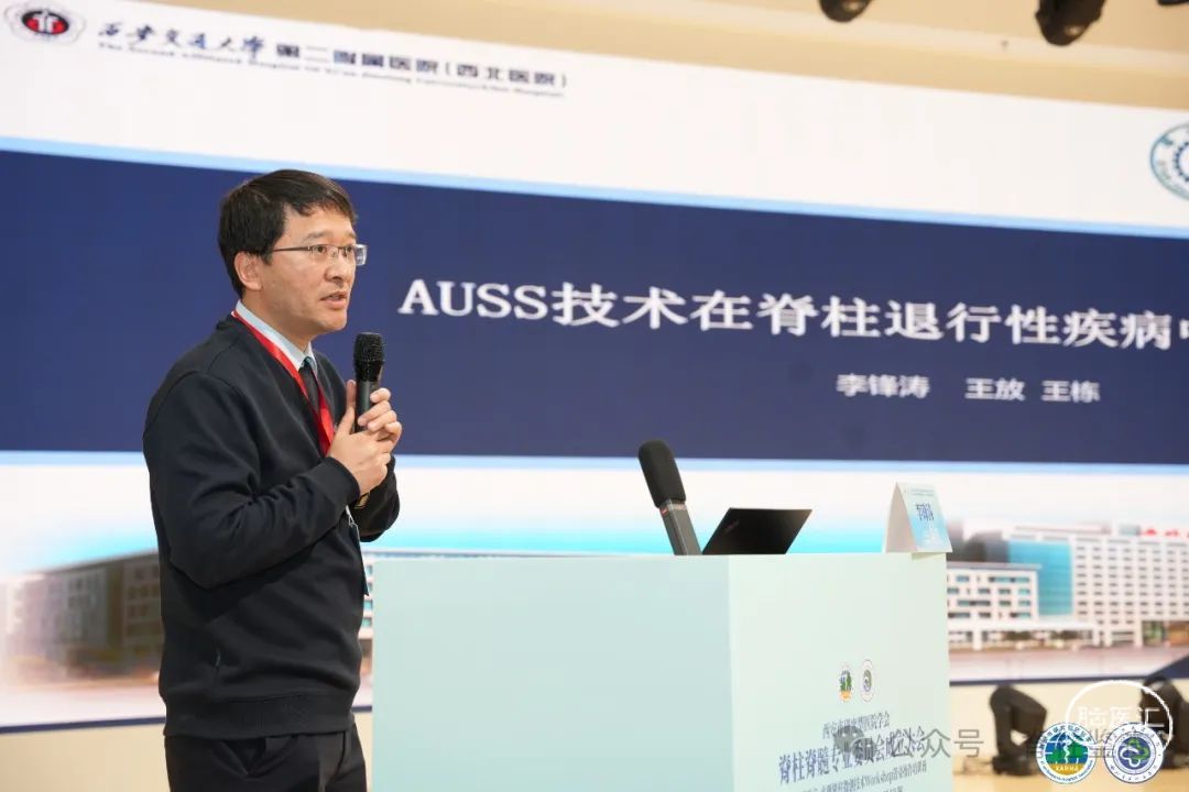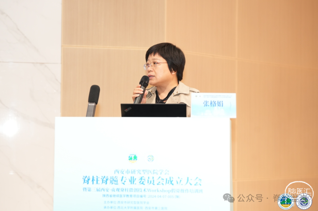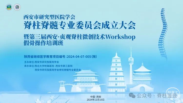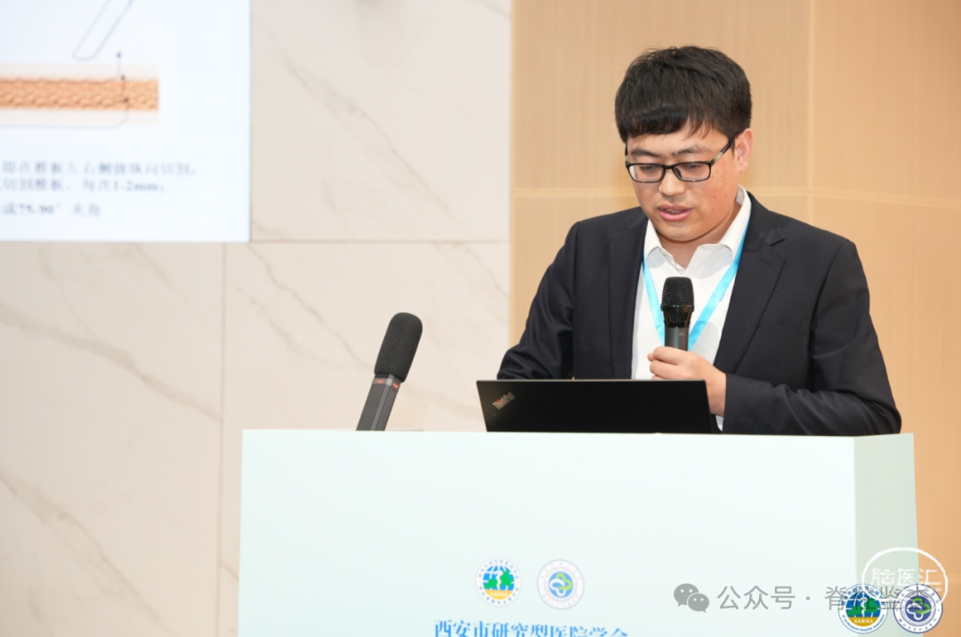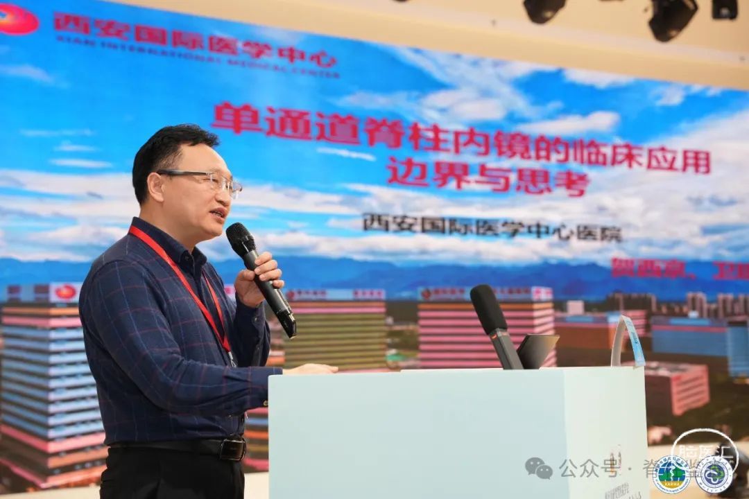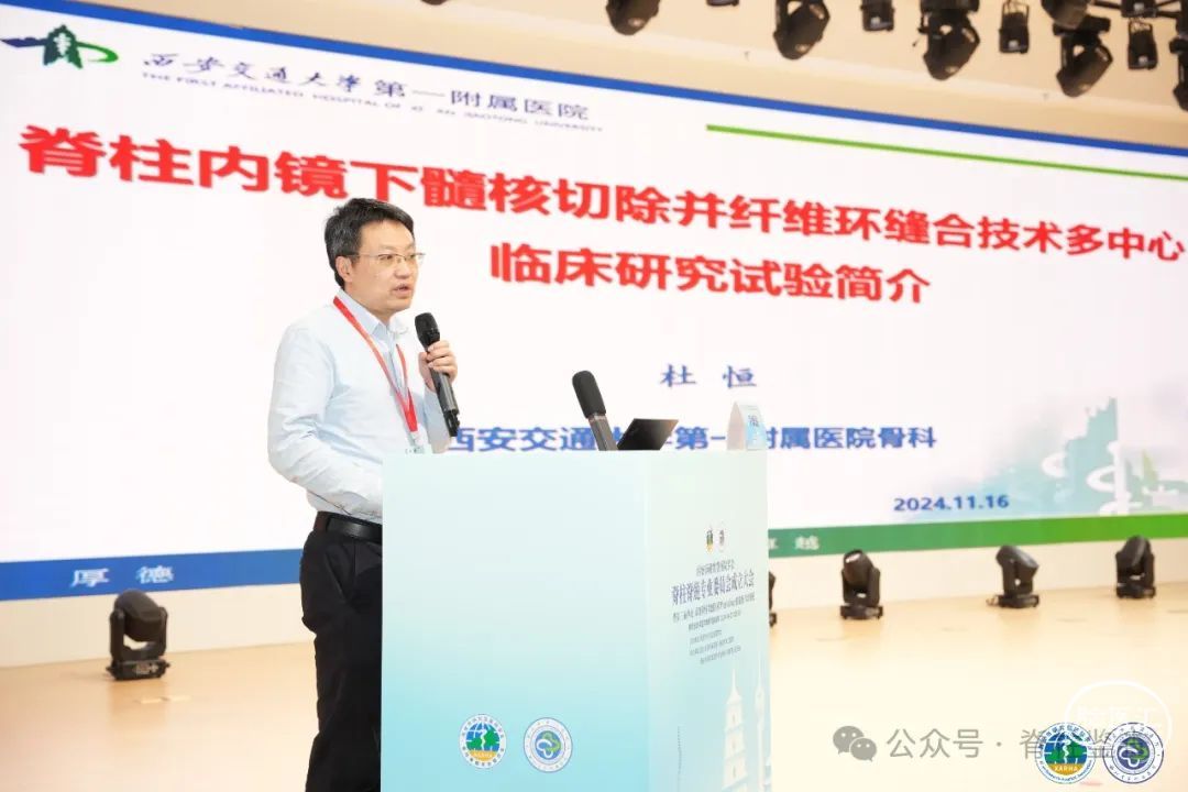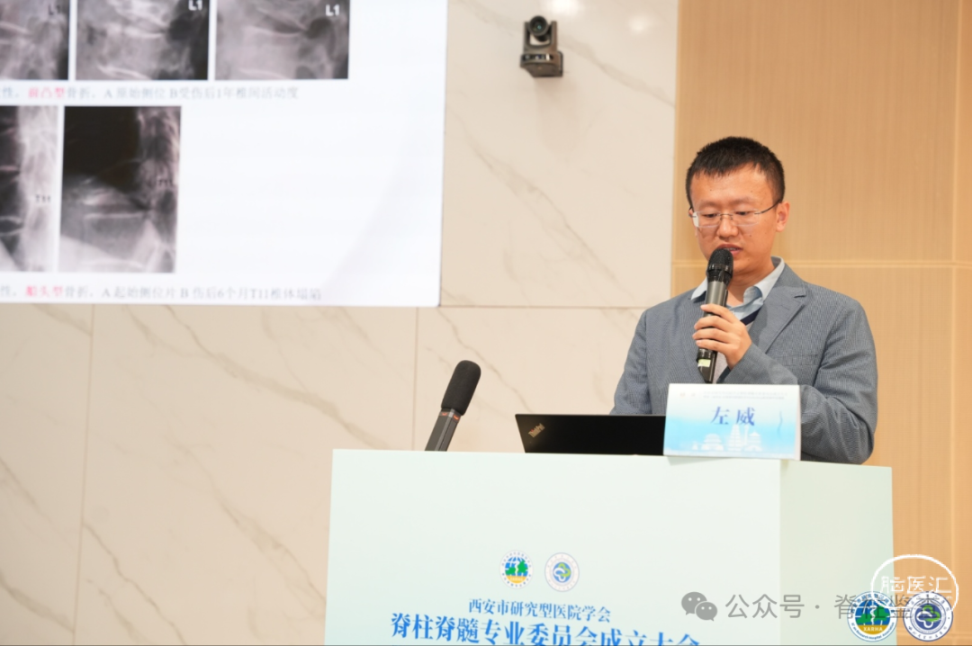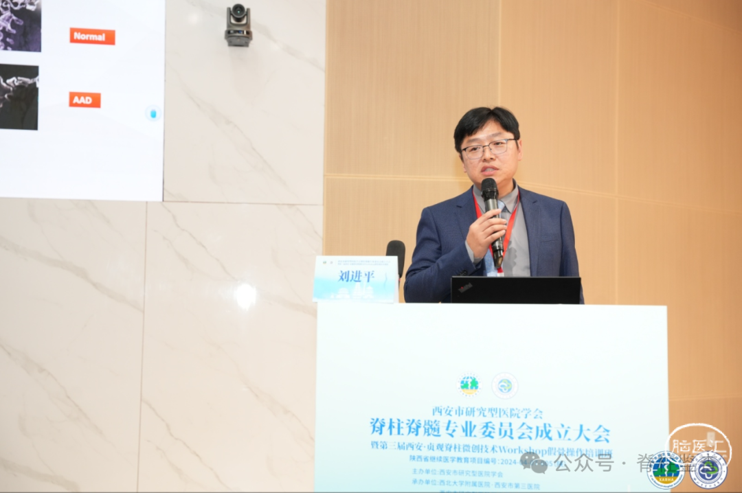 西安市研究型医院学会副会长钱露为脊柱脊髓专委会揭牌并致辞。钱露副会长对一直以来支持和关心脊柱脊髓医学的领导和嘉宾表示感谢,并介绍研究型医院学会的相关工作,同时对脊柱脊髓专业委员会工作提出相关要求。西北大学附属医院·西安市第三医院副院长石耀武代表医院致辞。石耀武副院长代表医院全体员工向远道而来专家、同道表示欢迎和感谢,向脊柱脊髓专业委员会成立表示祝贺;同时希望专委会充分发挥作用,提高脊柱脊髓疾病诊疗水平,造福患者。西北大学附属医院·西安市第三医院脊柱外科江伟教授当选首任主任委员,并表态:专委会将搭建一个交流学习、合作共进的平台,同时强调了今后将从学术交流、人才培养等四方面开展工作,共同促进脊柱脊髓疾病诊疗水平提升,服务患者。同时,西北大学附属医院·西安市第三医院还被中国椎间盘纤维环中心授牌为椎间盘内镜修复多中心研究课题单位。学术会议中,来自国内和省内的专家们就“上颈椎疾病、椎管狭窄、椎管内肿瘤治疗”“脊柱疾病荟萃”“脊柱微创技术”和“脊柱疾病鉴别、康复、病例讨论”四个章节分别分享。首都医科大学宣武医院陈赞教授分享《PFDF技术治疗寰枢椎脱位专家共识2024解读》。首都医科大学附属北京天坛医院贾文清教授分享《脊髓海绵状血管畸形的治疗策略》。首都医科大学三博脑科医院范涛教授分享《颅底凹陷的分型及手术治疗》。解放军总医院第四医学中心任东风教授分享《腰椎管狭窄的治疗方式演变及思考》。西安交通大学第二附属医院李浩鹏教授分享《胸椎管狭窄治疗的策略及关键技术》。四川省人民医院刘进平教授分享《寰枢椎脱位的外科治疗策略》。西安交通大学第一附属医院王宁教授分享《小脑扁桃体下疝畸形的外科治疗》。西北大学附属医院·西安市第三医院江伟教授分享《颅颈交界区脊膜瘤手术治疗体会》。南昌大学第一附属医院张斌教授分享《椎体成形术后责任椎体感染原因分析及治疗策》。西安交通大学第一附属医院李维新教授(程超替发言)分享《腰椎短缩治疗难治性脊髓拴系》。西北大学附属医院·西安市第三医院张格娟教授分享《神经内科与脊柱外科常见疾病的鉴别诊断》。空军军医大学唐都医院王鹏教授分享《骶尾部肿瘤的手术治疗策略体会》。张家港市第一人民医院张立教授分享《垂头综合征的诊断和治疗》。首都医科大学宣武医院王凯教授分享《微创治疗退变性脊柱侧弯》。复旦大学附属闵行医院江晔教授分享《经皮穿刺脊柱内镜处理颈椎病的治疗策略》。江西省人民医院肖强教授分享《颈椎后路全内镜技术治疗神经根型颈椎病》。西安交通大学第一附属医院杜恒教授分享《脊柱内镜下腰椎髓核摘除术联合纤维环缝合术的临床运用及多中心RCT临床试验》。西宁市第一人民医院关炳瑜教授分享《单轴脊柱内镜下融合技术的体会》。宁夏固原市原州区人民医院万欣龙教授分享《微通道显微镜下手术治疗腰椎管狭窄的体会》。西安国际医学中心医院卫建民教授分享《单通道内镜临床应用的边界与思考》。西安市红会医院杨俊松教授分享《Find the key and dig the hole:快速玩转颈椎后路内镜keyhole减压》。西安交通大学第二附属医院李锋涛教授分享《AUSS技术在脊柱退行性疾病中的应用》。兵器工业总医院刘少军教授分享《UBE在神经根型颈椎病中的应用》。陕西中医药大学附属骨伤医院赵胜杰教授分享《生理性逻辑等运动疗法在脊柱相关疾病康复中的应用体会》。延安大学附属医院强京灵教授分享《颈椎前路术后并发症病例讨论》。西安交通大学第一附属医院程超教授分享《脊髓电刺激SCS治疗下肢缺血性病变临床体会》。西北大学附属医院·西安市第三医院左威主治医师分享《胸腰椎骨质疏松骨折的分型及手术策略》。西北大学附属医院·西安市第三医院杜占主治医师分享《超声骨刀在脊柱脊髓手术中的应用体会》。江伟教授在会议总结中再次表达对各级领导和国内、省内专家学者的支持表示感谢,并强调“脊柱脊髓,大有可为”今后专委会将定期举行培训班、沙龙、技术帮扶等培养脊柱微创技术专业人才、提升脊柱微创技术,造福脊柱疾病患者!