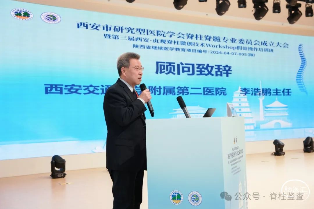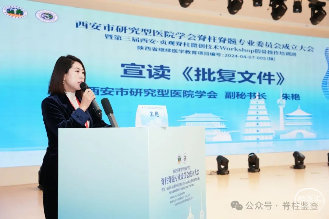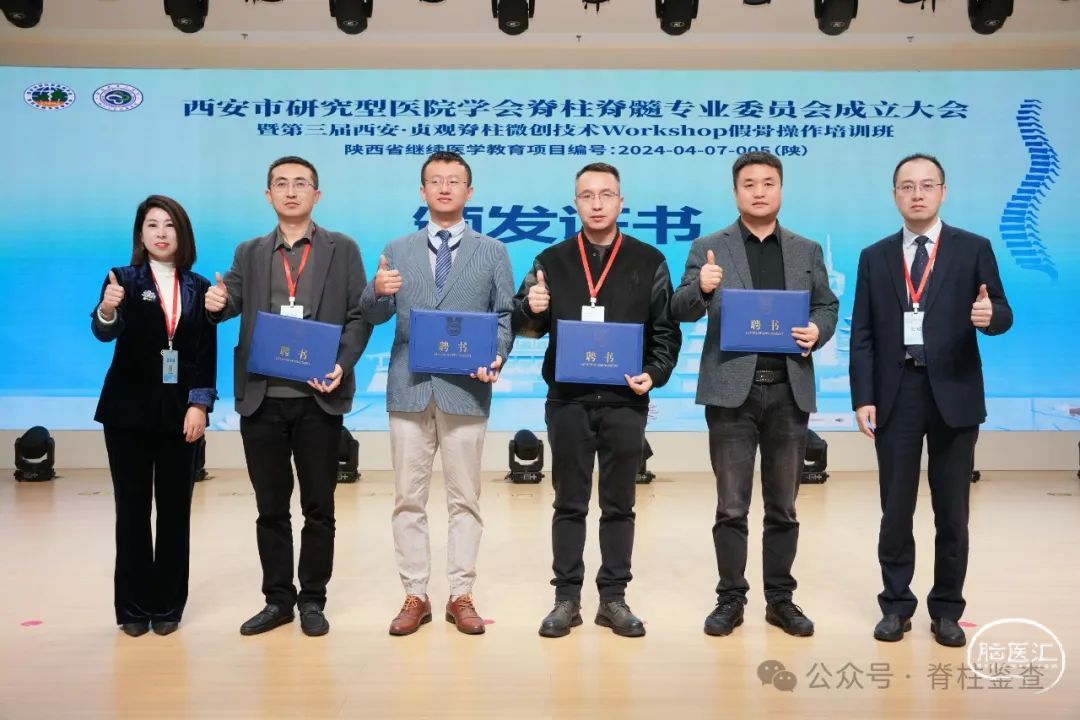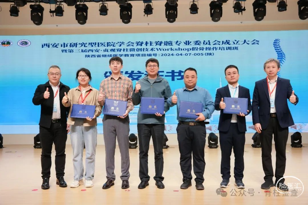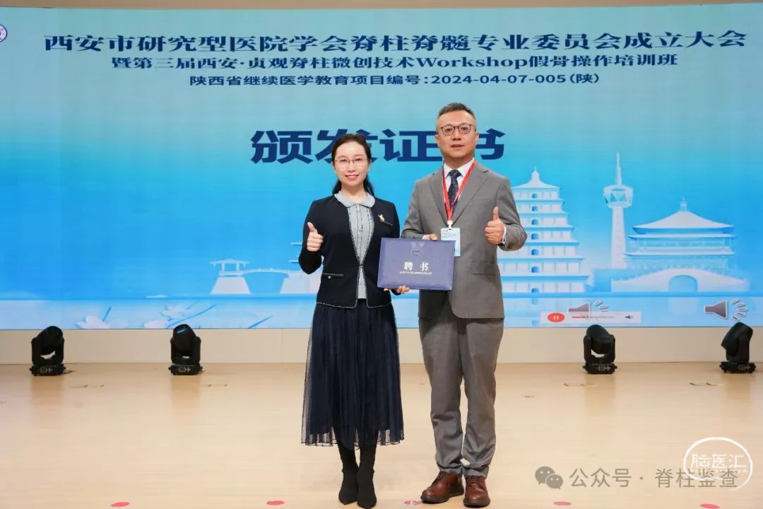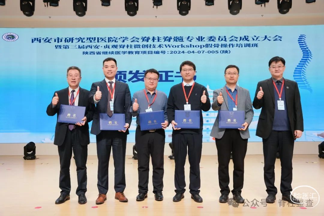 西安交通大学附属第二医院李浩鹏教授受邀担任脊柱脊髓专业委员会顾问并致辞。西安市研究型医院学会副秘书长朱艳宣读关于学会成立脊柱脊髓专业委员会的《批复文件》。会议现场,根据选举结果产生主任委员、副主任委员、常务委员等,并颁发聘书。
