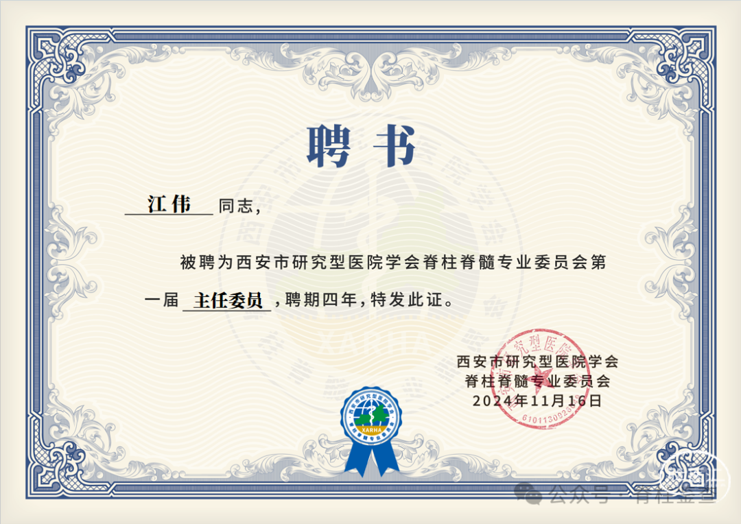 2024年11月15~16日,西安市研究型医院学会脊柱脊髓专业委员会成立大会在西安举办,西北大学附属医院·西安市第三医院脊柱外科江伟教授当选首任主任委员。国内及省内十数位脊柱脊髓疾病知名专家出席、分享经验,各级医院相关专科从业者150余人参加。