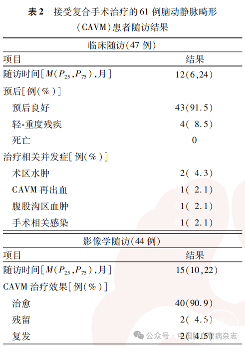 本研究结果表明,复合手术治疗CAVM具有一定的安全性与有效性,基于随访结果,患者预后良好率为91.5%,CAVM影像学闭塞率为90.9%,治疗相关并发症发生率10.6%(5/47)。一项回顾性研究纳入了150例接受复合手术治疗的CAVM患者,其治疗相关死亡及神经功能障碍发生率为7.3%(11/150),CAVM影像学治愈率为90.7%(136/150)[15]。一项回顾性研究纳入了37例接受复合手术治疗的CAVM患者,其复合手术后CAVM治愈率为100.0%[16]。另有一项纳入54例接受复合手术治疗CAVM患者的回顾性研究结果显示,术后1年预后良好率为97.7%(42/43)[17]。本研究结果与文献报道相近,提示复合手术治疗CAVM具有较好的安全性与有效性。