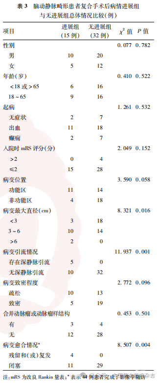 47例完成临床随访的患者中有15例患者出现症状进展,32例患者症状无进展。两组患者性别、年龄、起病症状、入院时mRS评分、病变位置、病变致密程度、合并动脉瘤或动脉瘤样结构的组间差异均无统计学意义(均P>0.05);进展组以病变最大径3~6cm为主,无进展组以病变最大径<3cm为主,进展组病变存在深静脉引流及残留和(或)复发,两组病变最大直径分布、病变引流及愈合情况的差异均有统计学意义(均P<0.05)。见表3。
