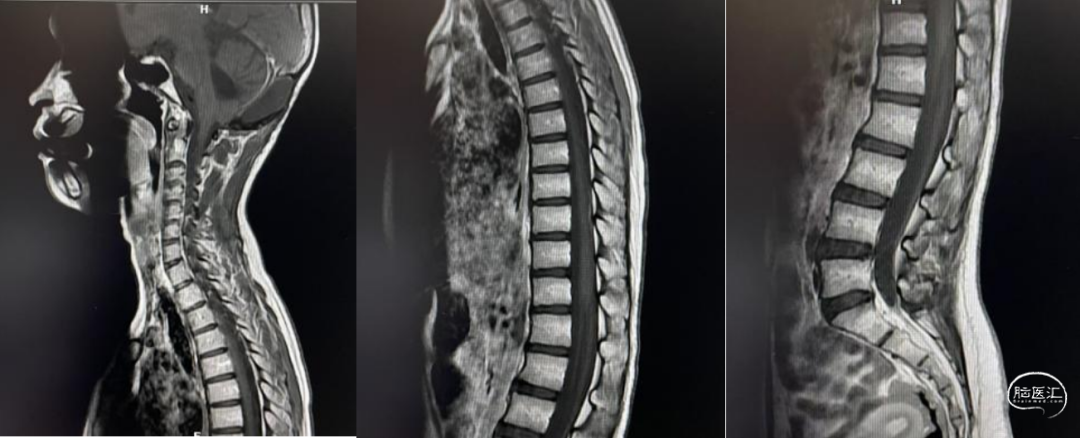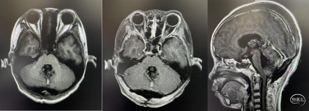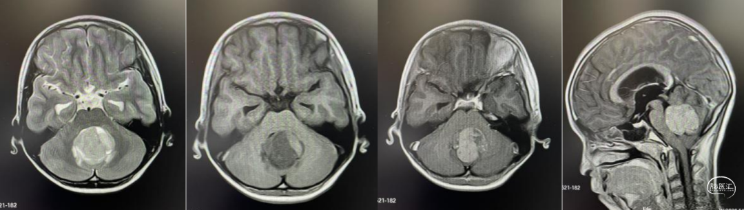 头部MRI显示:小脑蚓部可见一团块样等T1、等-长T2信号灶,边缘模糊,大小约3.5*3.6cm,增强后病灶明显强化,第四脑室明显受压,慕上脑室轻度扩张,中线结构居中。
