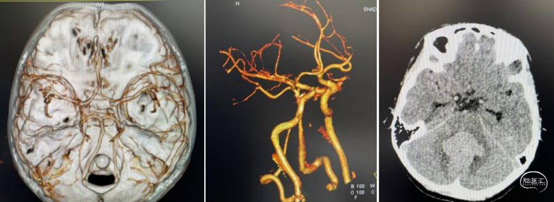 头部CT及CTA检查:小脑蚓部可见3.8*3.7cm的高密度灶,CT值约33-63HU,周围可见低密度带。增强后病灶未见明显强化。四脑室受压,幕上脑室扩张。余双侧脑实质内未见明显异常密度灶,脑沟、脑裂及脑池未见异常,中线结构无移位。颅脑CTA三维成像示:病灶内可见小脑后下动脉穿行其中。双侧颈内动脉颅内段、双侧椎动脉颅内段、基底动脉、双侧后交通动脉、前交通动脉及双侧大脑前、中、后动脉及分支显示好,形态、大小、分布未见异常;未见狭窄、闭塞,未见畸形血管影。