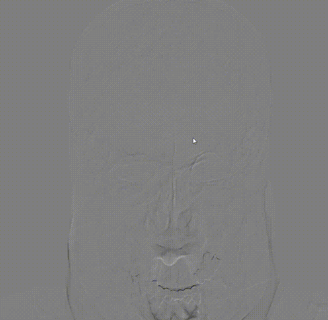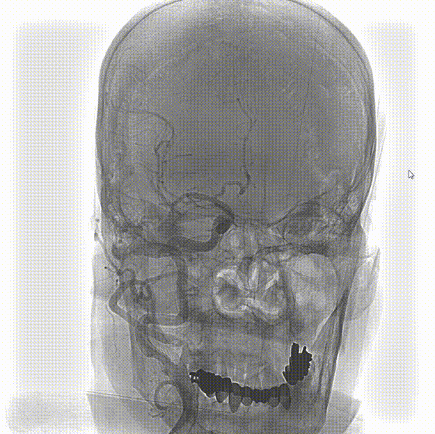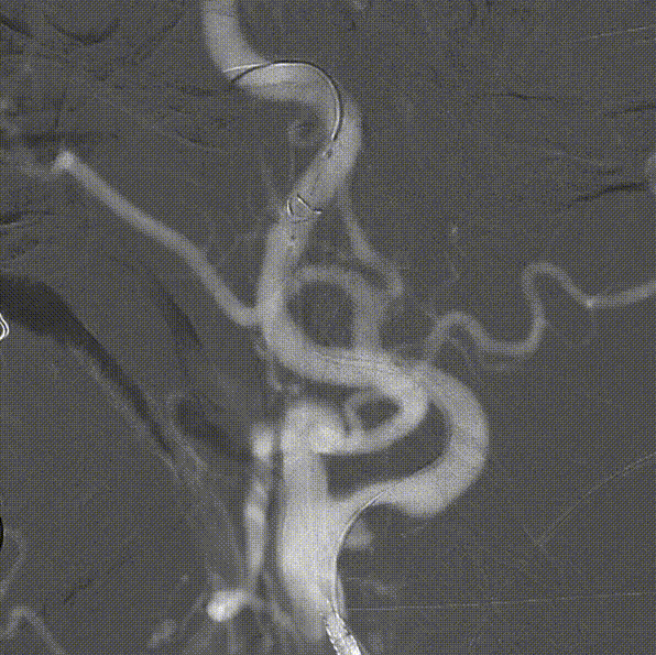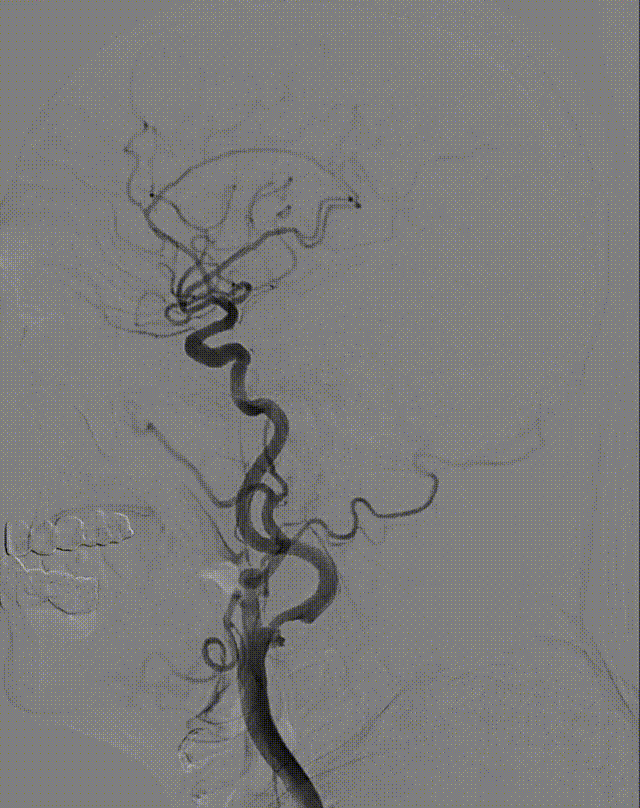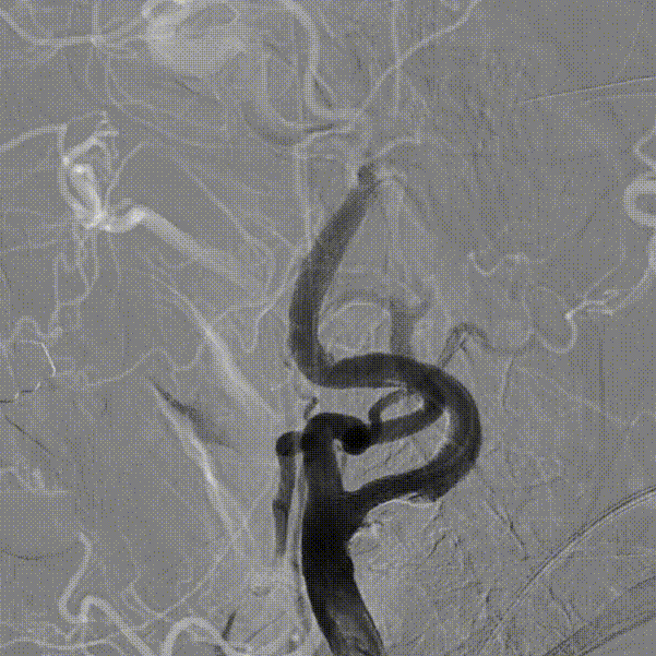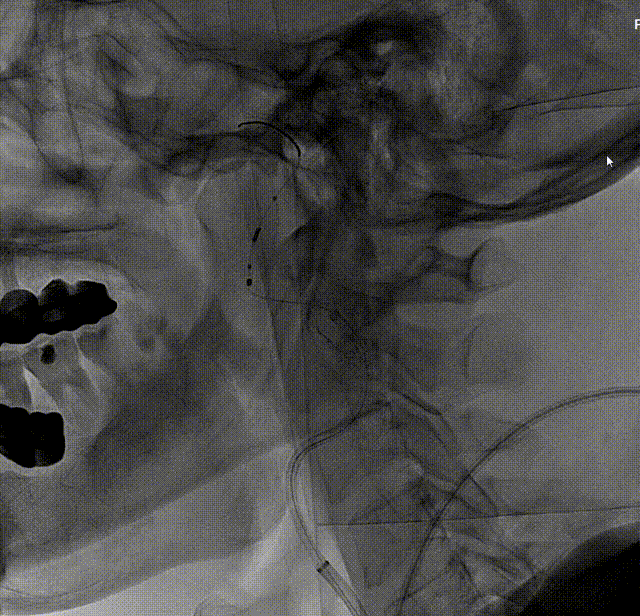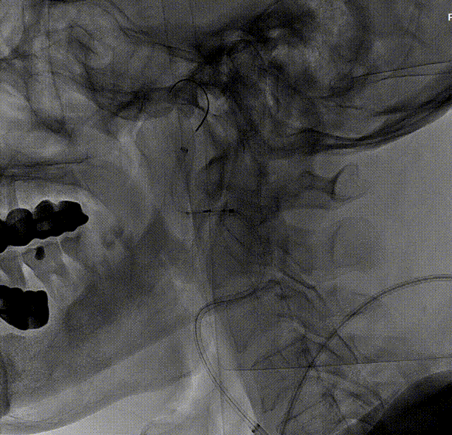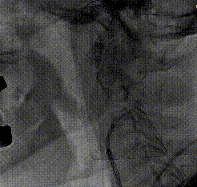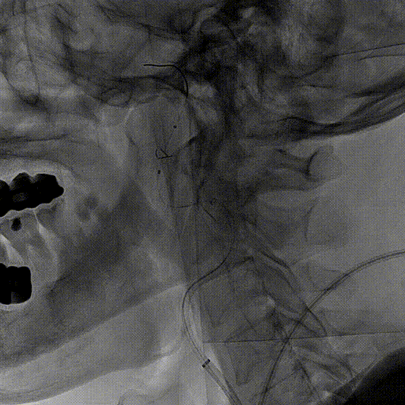 考虑到靶血管较迂曲,拟使用中间导管进行支架释放。在Workhorse导丝引导下,将中间导管通过迂曲段,经由中间导管送入8mm*40mm颈动脉支架至右侧颈内动脉狭窄处。回撤中间导管至颈总动脉后,在透视状态下准确释放支架。