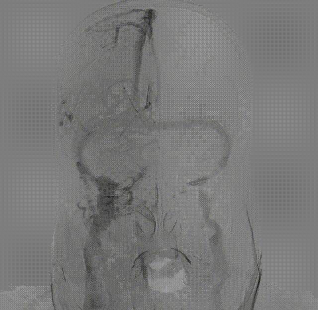 造影显示残余狭窄小于30%,未进行后扩张。术后造影显示狭窄解除,支架置入部位满意,血流较术前明显改善。使用中间导管将Nav6保护伞顺利回收后,对股动脉穿刺点进行止血,患者安返病房。