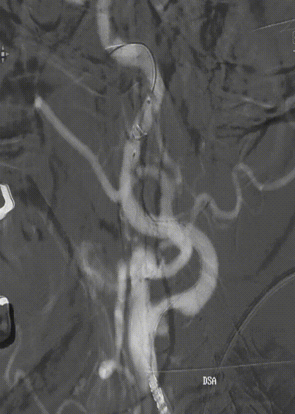 患者取平卧位置,常规消毒、铺巾和局麻右侧腹股沟下穿刺点后,穿刺置入5F动脉鞘,再以5F单弯行选择性脑动脉造影。造影示:II型主动脉弓,右侧颈内动脉C1段重度狭窄。