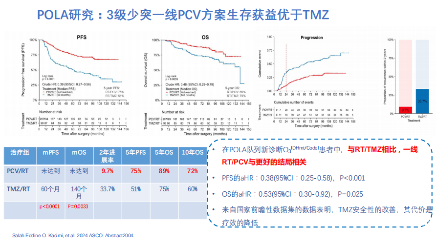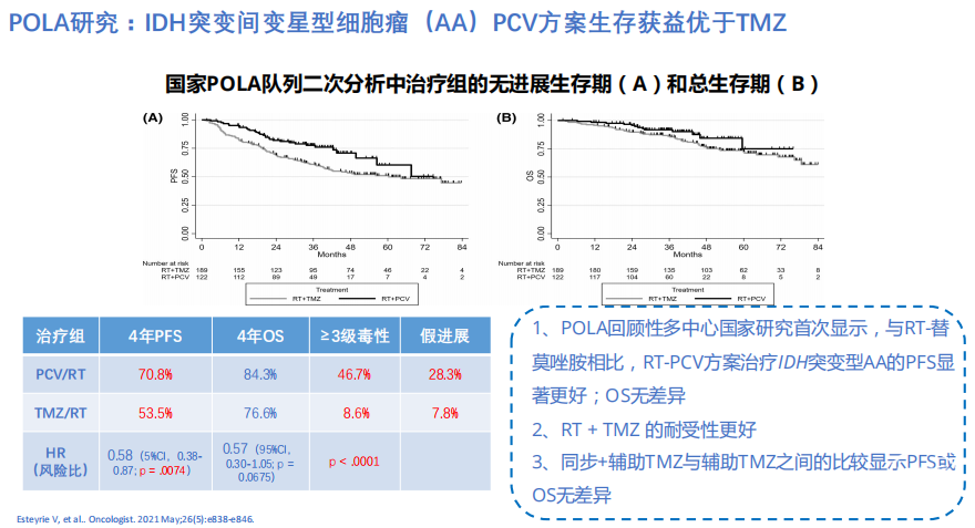 POLA研究表明IDH突变间变星型细胞瘤(AA)PCV方案生存获益优于TMZ。与放疗联合替莫唑胺相比,放疗联合PCV方案治疗IDH突变间变星形细胞瘤的PFS显著更好,OS无差异[1]。
