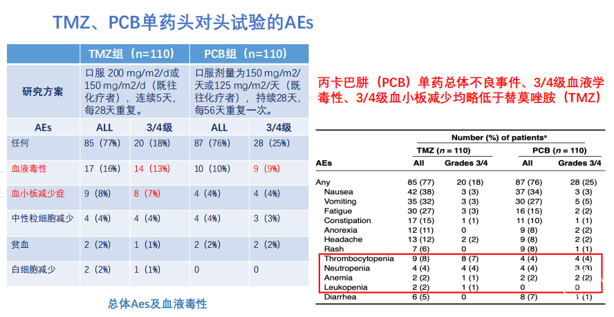 汪洋教授介绍了一项关于替莫唑胺(TMZ)和丙卡巴肼(PCB)单药头对头、随机、多中心、开放标签、 II期研究[3]表明丙卡巴肼(PCB)单药总体不良事件、3/4级血液学毒性、3/4级血小板减少均略低于替莫唑胺(TMZ)。