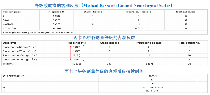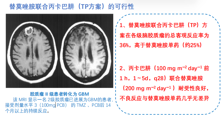一项替莫唑胺联合丙卡巴肼(TP方案)的可行性研究[4]表明,替莫唑胺联合丙卡巴肼(TP)方案在各级脑胶质瘤的总客观反应率为36%,高于替莫唑胺单药(约25%)。
