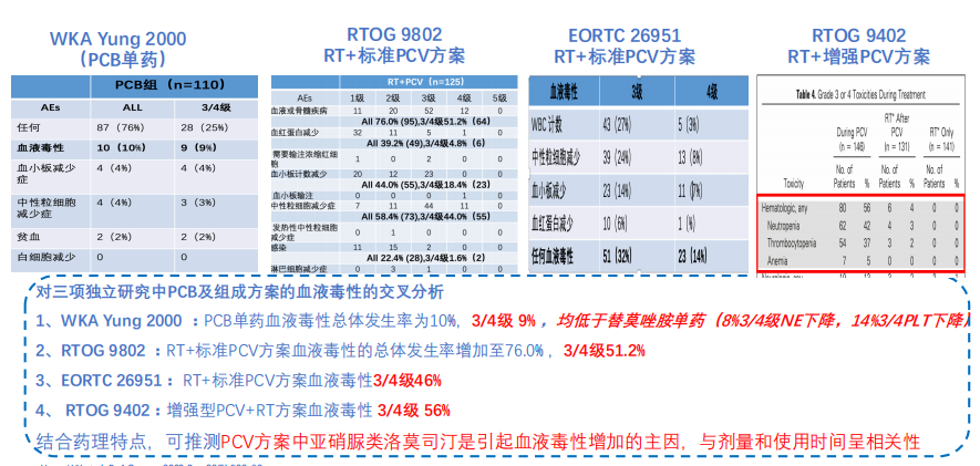 对三项独立研究中PCB及组成方案的血液毒性进行交叉分析,推测PCV方案中亚硝脲类洛莫司汀是引起血液毒性增加的主因,与剂量和使用时间呈相关性。