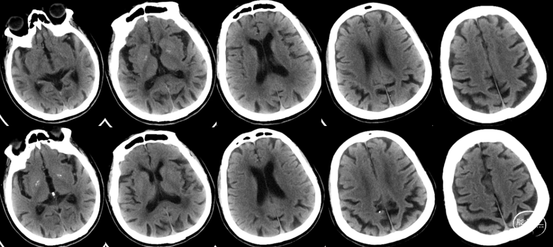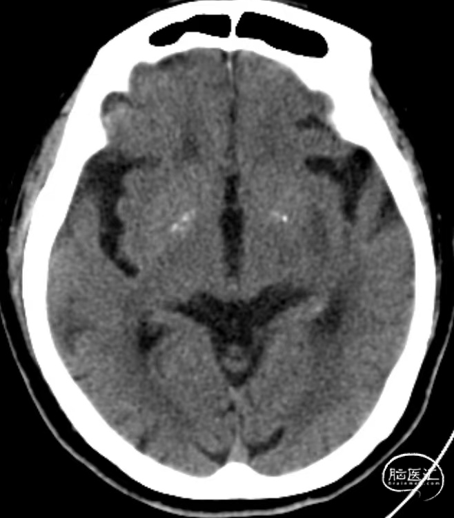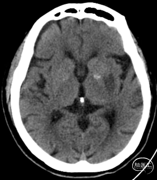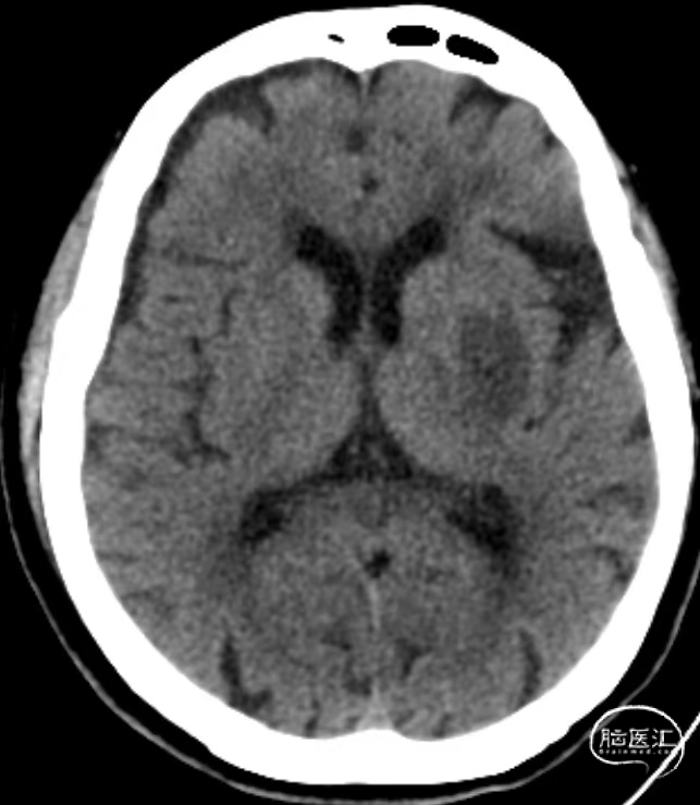 现病史:患者凌晨4点半左右步行去卫生间,排便后突然出现右侧肢体活动不灵、言语含糊,逐渐意识不清,倒在卫生间地上,症状无缓解。家人发现后拨打120急送我院,急诊行头CT后,为进一步诊治收入我院。