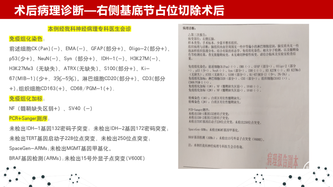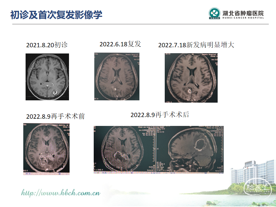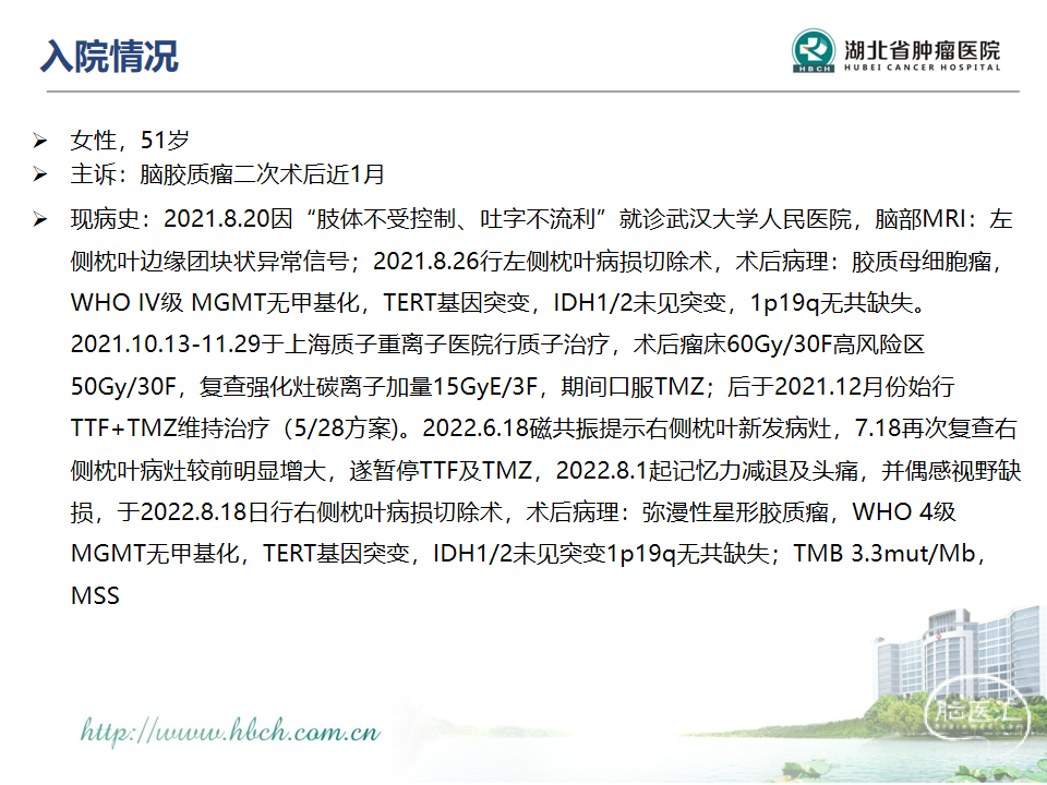 湖北省肿瘤医院病理科王满香教授:该患者初诊和复发部位不同,两次手术均是外院执行的,经我科会诊,组织学形态均为高级别胶质瘤,结合两次NGS检测结果,复发病灶与初诊病灶基因突变一致,均为TERT启动子突变,无IDH1/2突变及1p/19q联合缺失,符合胶质母细胞瘤,CNS WHO 4级。