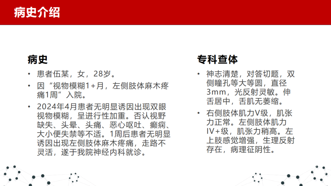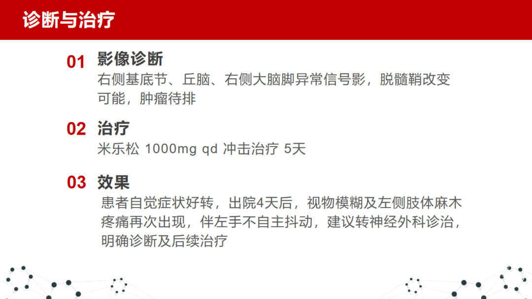 华西医院神经内科:该病例青年女性,亚急性起病,定位右侧丘脑基底节病变,定性存在困难,病理上脱髓鞘加上淋巴套证实是免疫性相关疾病,常见免疫六项指标阴性,导致诊断不明确。激素治疗后症状缓解证,另今日复查新发病灶信号减弱更倾向免疫相关疾病,建议复查免疫六项指标,继续随访。