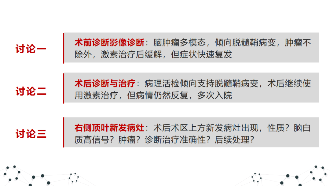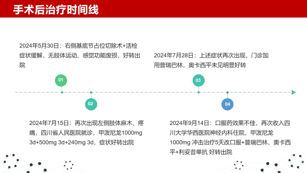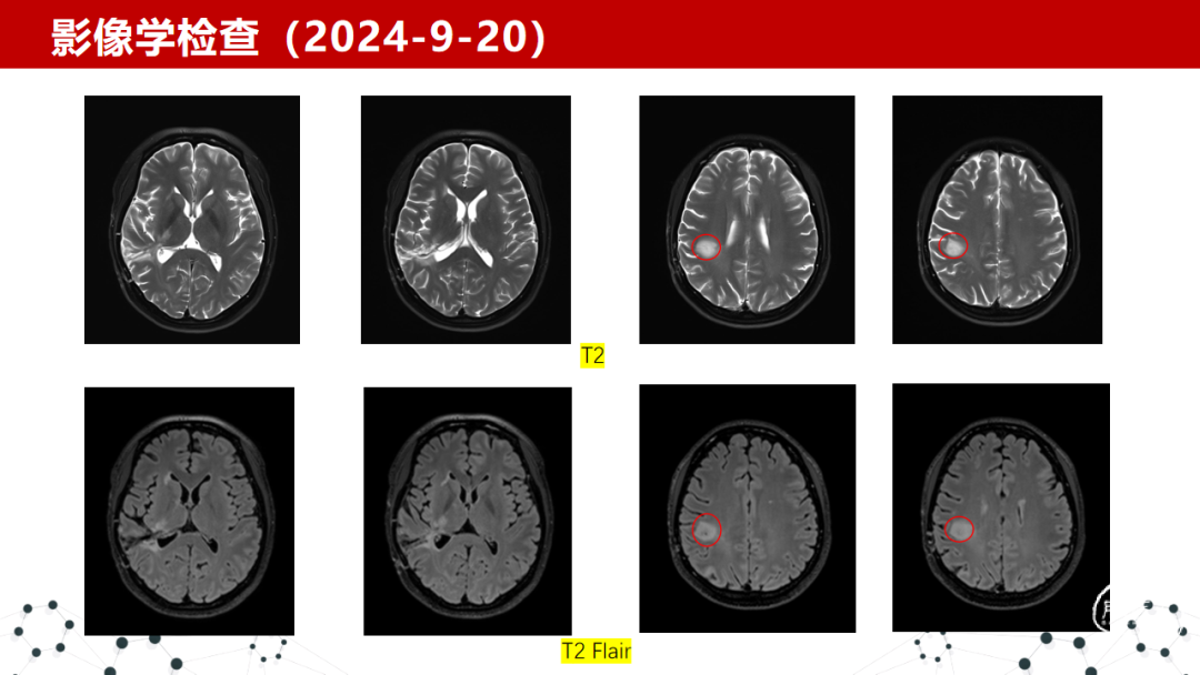 华西医院神经外科:该病例在术中显微镜下病灶明显,大量淋巴细胞,病理诊断支持脱髓鞘,进行规范内科治疗,但病情反复,今日复查显示新发病灶信号减弱。
