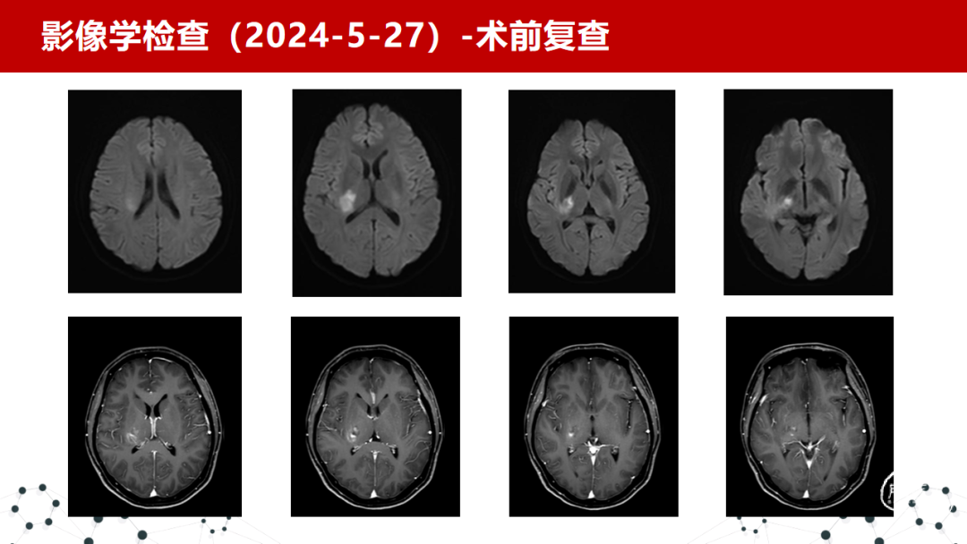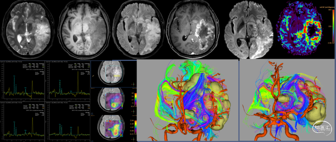 湖北省肿瘤医院影像科苏佳佳教授:该病例的脑磁共振并未显示除PPT展示部位之外的其他部位的病灶,对于脑胶质瘤的磁共振扫描,包括了T1加权、T2加权、DWI、T2 FLARE、灌注等等,相较于常规脑磁共振扫描更加全面,以更清晰准确的发现微小病灶及更好地区分胶质瘤与脑转移瘤特征。