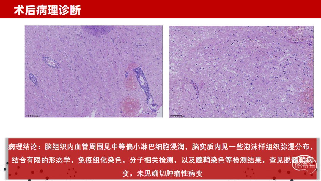华西医院病理科:该病例形态学组织细胞聚积,有淋巴血管泡改变,考虑非肿瘤病变,在排除肿瘤性病变的情况下考虑非肿瘤病变,典型区域呈致密的组织细胞聚集,髓鞘脱失,轴索是相对保存的,结合组织学,符合脱髓鞘改变,具体病因不能明确,需要结合临床。