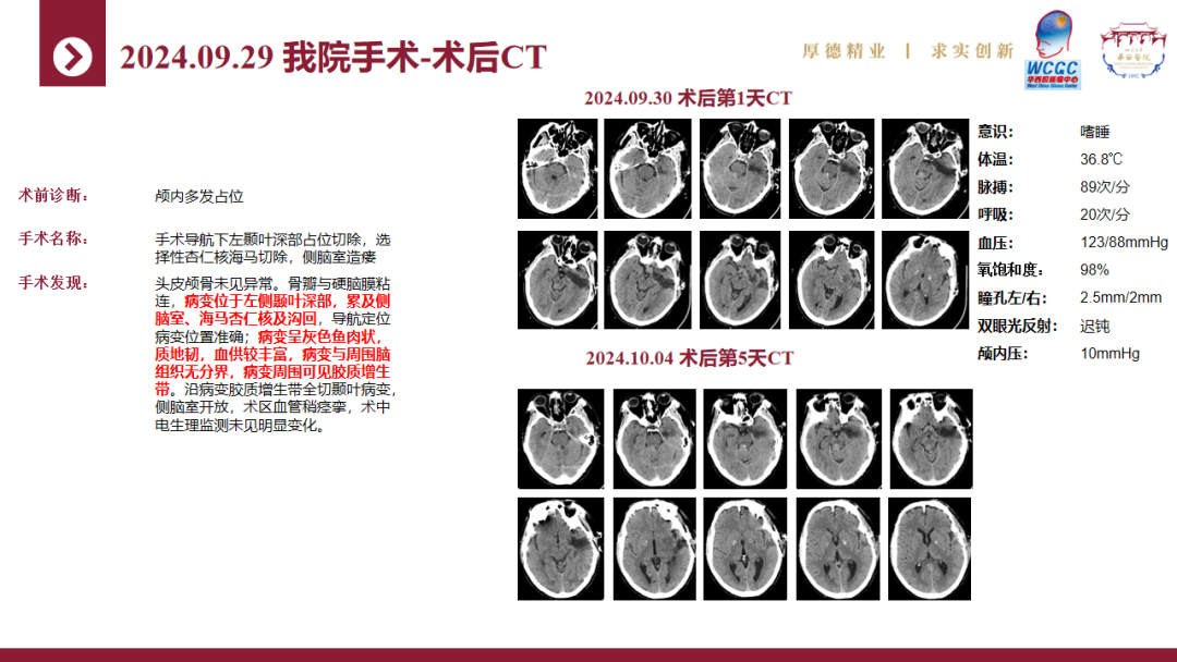 以下是术后影像,术后1天CT显示颞叶病灶大部分切除,术后5天CT术腔缩小,术后6天核磁术腔与CT表现一致,颞叶病变靠前可能有残留,中脑病灶有强化结节。也提示,中脑病灶恶性程度可能不同于颞叶和额叶病灶。