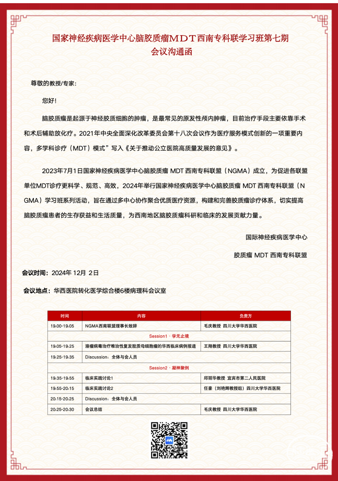 2023年7月1日四川大学华西医院的MDT团队携手西南地区21家医院MDT团队,在国家神经疾病医学中心脑胶质瘤MDT专科联盟(NGMA)支持下,共同组建“西南脑胶质瘤MDT专科联盟”。联盟将致力切实提高西南地区乃至全国患者生活质量与生存获益,引导脑胶质瘤优质集中医疗资源辐射和下沉,赋能区域医学中心、基层医疗机构,切实推动脑胶质瘤及中国神经系统肿瘤疾病医学领域的建设与发展。