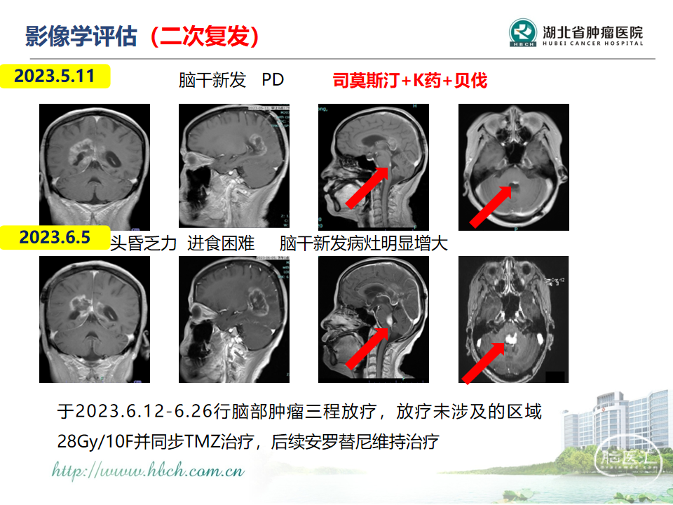 湖北省肿瘤医院放化疗科韩光教授:该患者复发模式比较特别,两次复发均不是胶质瘤最常见的原位复发,而是远处复发,且位置均相对独立。对于这种复发性胶质母细胞瘤的治疗也是在探索中尝试,在尝试中探索,尤其二次复发出现在脑干部位,这类病例的复发治疗是否按常规治疗以及是否有更好的治疗方案值得思考。