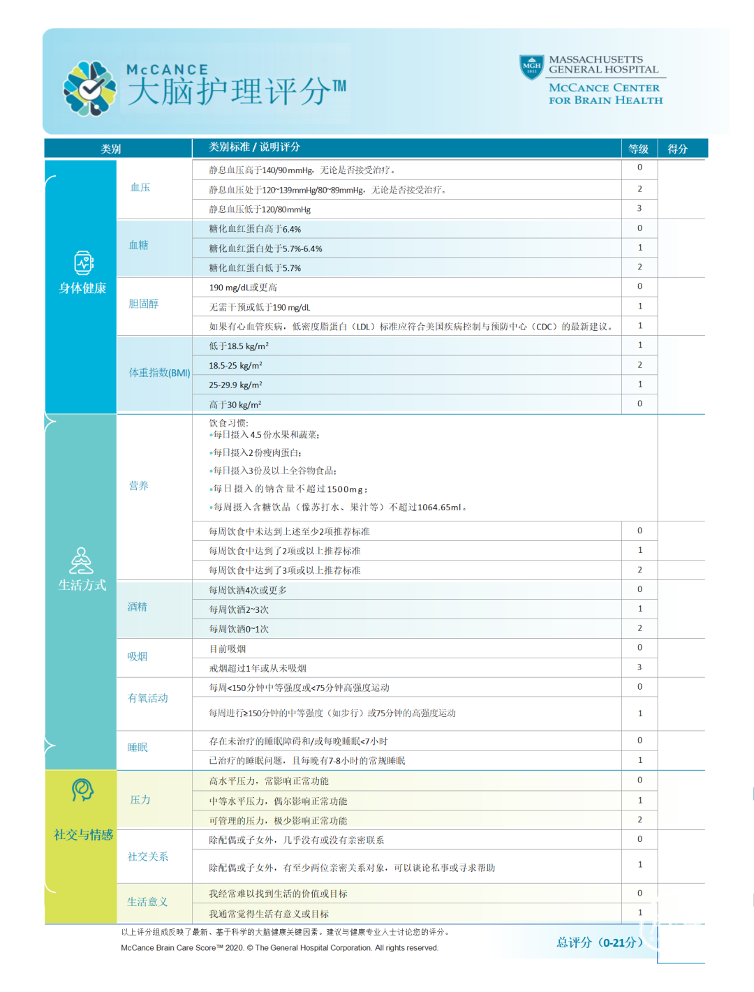 为了帮助人们更好地“照顾”自己的大脑,美国哈佛大学医学院附属麻省总医院McCance脑健康中心的临床转化项目组开发了一个评分工具——McCance大脑护理评分™(BCS,【中文版】可在文末查阅或自测)。该评分工具由生理健康、生活方式和社会情感这三个主要类别组成,目的是为了评估人们在保护和延长大脑健康方面所做出的努力,包括锻炼、睡眠、社交互动、降低血压等等,为降低痴呆、卒中和老年期抑郁症的潜在患病风险提供了切实可行的路径。