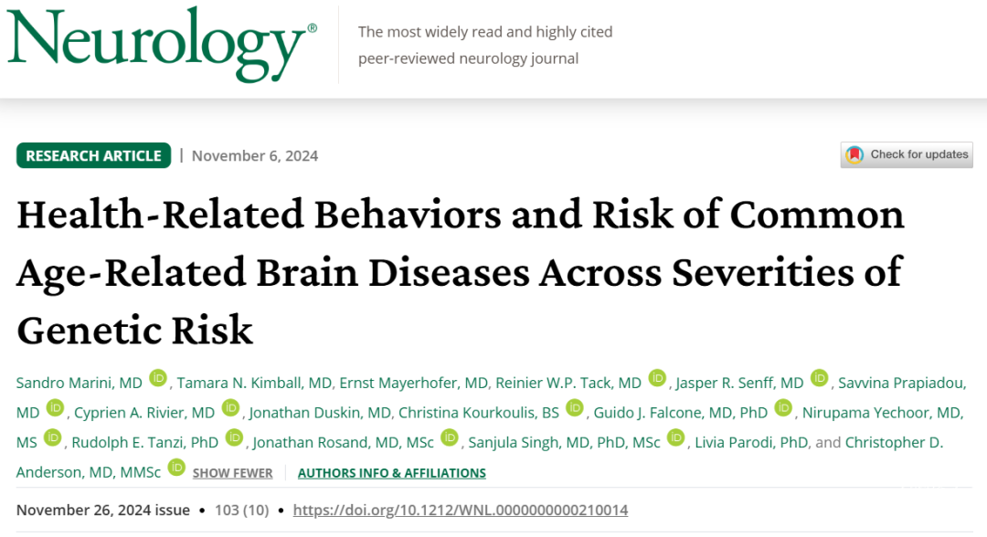 有了适当的评分工具,关键的问题便在于我们的生活方式要改变到何种程度,才能对患病风险的遗传性基因差异产生影响。为了解答这个问题,美国哈佛大学医学院领衔的研究团队使用BCS评分工具,针对因遗传因素更易患上卒中、老年期抑郁症和痴呆的人群,探索了健康生活方式的选择是否能够降低患上这些疾病的风险。相关研究结果于2024年11月6日以“健康相关行为与不同基因风险水平下的常见年龄相关脑部疾病风险”为题,在线发表在美国神经病学学会权威医学期刊《Neurology》上。