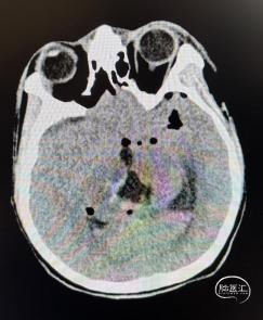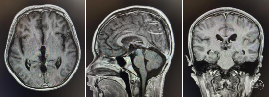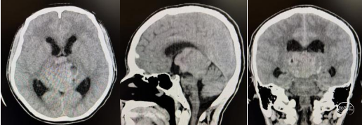 头部CT显示:松果体区见等-低-稍高密度肿块,内见少许小囊变,CT值约18-50HU,邻近脑实质受压,中脑导水管及第三脑室受压,双侧侧脑室扩大。