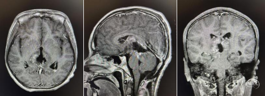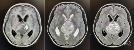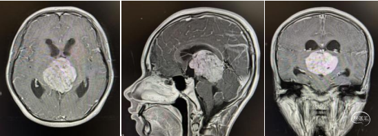 头部MRI显示:松果体区可见一形态不规则肿块,大小约52mm*50mm*51mm,其内信号混杂,呈短-长T1,短-稍长-长T2信号,增强后实质部分可见明显不均匀强化。肿瘤部分突入三脑室内,与三脑室左侧壁及左侧丘脑分界不清,中脑导水管受压变窄,三脑室及侧脑室扩张。右侧脑室前角可见一引流管影。