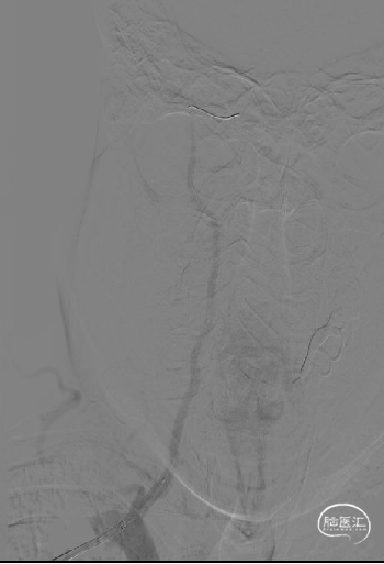 患者取平卧位,常规消毒术区皮肤,置无菌单,右侧桡动脉局麻后,行右侧桡动脉Seldinger法穿刺,并置入6F动脉鞘,以180cm超滑泥鳅导丝携单弯管行选择性脑动脉造影。造影结果示:右侧椎动脉V1段重度狭窄。