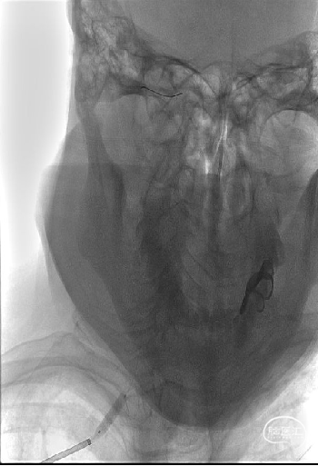 沿泥鳅导丝将6F 95cm远端通路导引导管送至右侧椎动脉开口近狭窄处,撤出泥鳅导丝,在路途下,将0.014inch 180cm导引导丝超选至右侧椎动脉V3段远端,沿微导丝将Bridge椎动脉雷帕霉素靶向洗脱支架送至右侧椎动脉V1段狭窄处,支架释放之前再次通过显影点,确认支架位于合适位置,排气后,以10-15s/atm缓慢加压至10atm打开输送系统球囊以扩张支架。