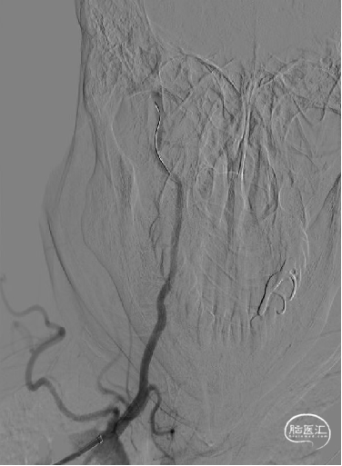 术前脑血管造影示:右侧椎动脉V1段重度狭窄。