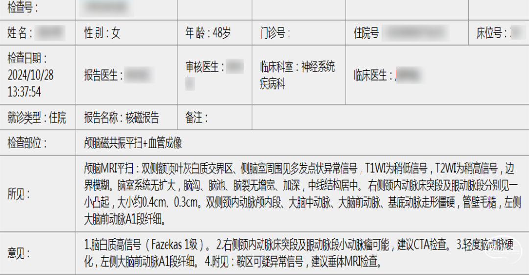 现病史:患者及家属诉患者3天余前无明显诱因出现头晕、头痛,以前额部疼痛为主,呈再发性,每当起床体位改变后症状明显,感恶心,无呕吐,休息后可缓解,无吞咽困难、饮水呛咳、肢体活动不灵,无心悸、胸闷、胸痛及呼吸困难,无腹痛、腹泻、黑便及大小便失禁、昏迷、抽搐等。现为求进一步诊治,自行至我院门诊就诊。门诊遂以“头晕、头痛查因”收住我科。
