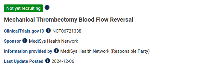 在此背景下,美国医疗服务系统MediSys Health Network计划开展一项“血流逆转技术联合机械取栓治疗”的开放标签、单臂、I期临床试验(NCT06721338),旨在改良AIS的机械取栓治疗,消除术后远端栓塞,同时实现再灌注。据悉,这项试验是首次结合血流逆转技术和标准取栓治疗的注册临床研究,主要目的是探索这种联合疗法对于卒中患者是否安全、可行和有效。