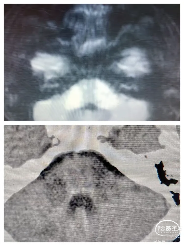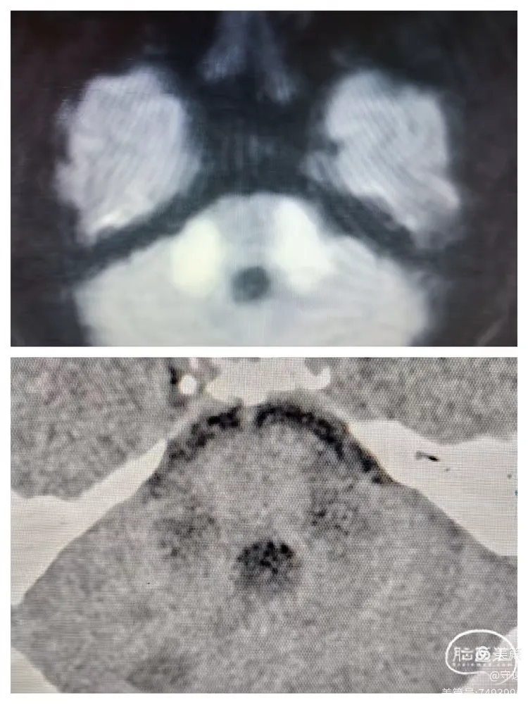 患者可按指令动作,言语障碍,左侧下肢力弱,生命体征正常。复查CT:双侧桥臂浅淡低密度影,与术前核磁大致相同,无出血征像。中脑、延髓区域未见明显梗塞。