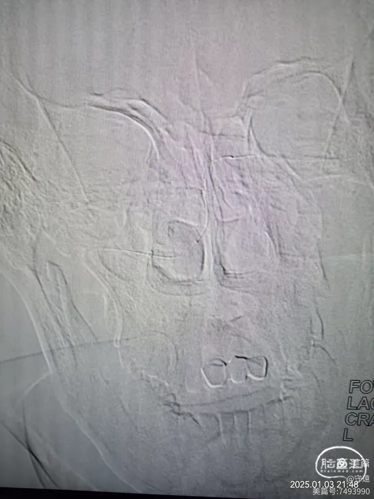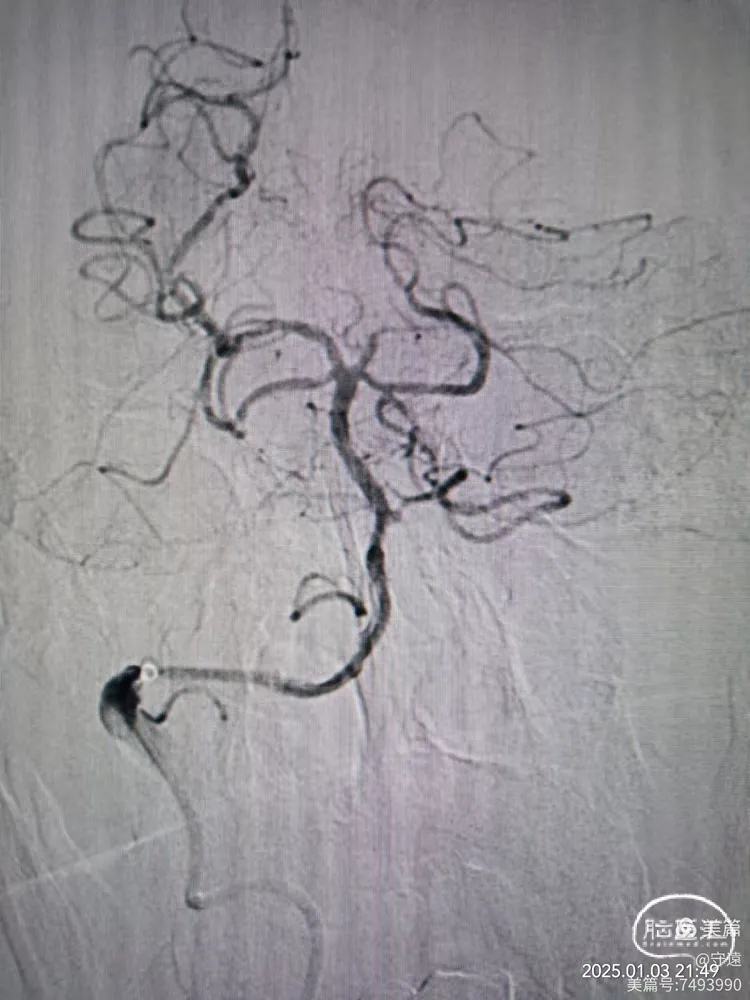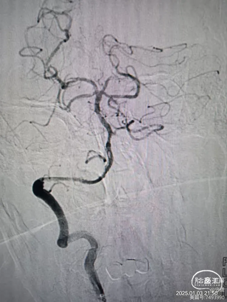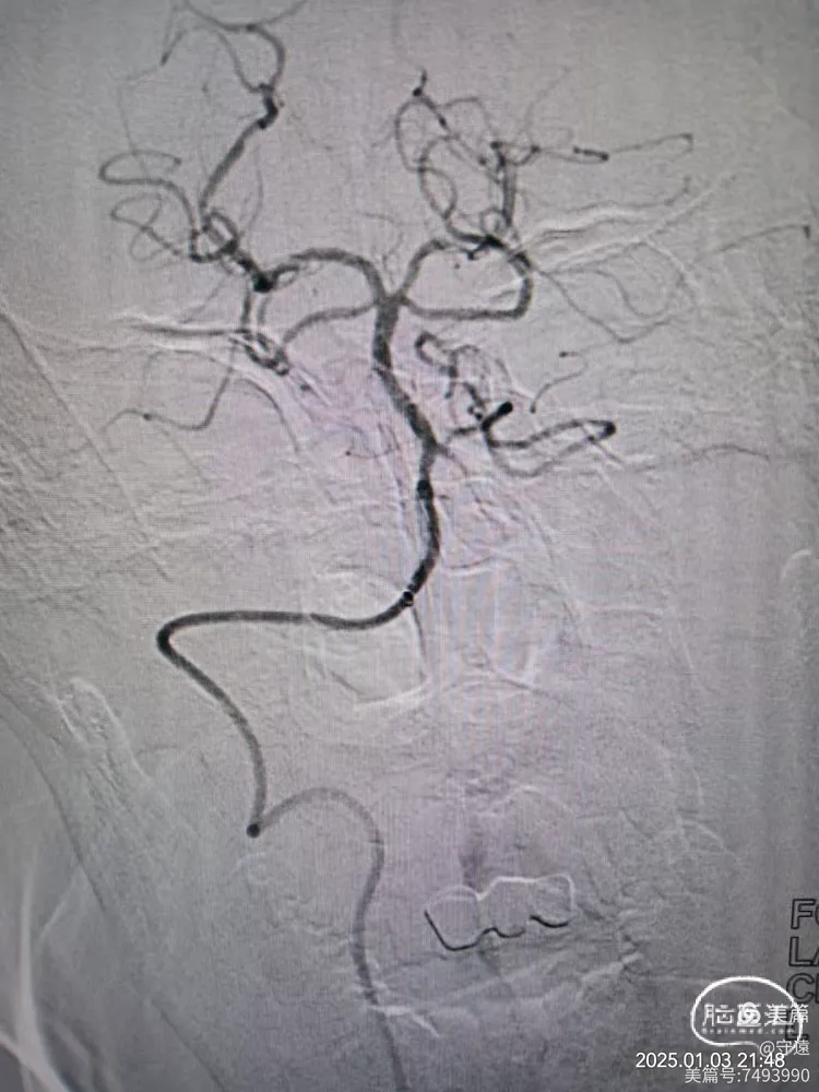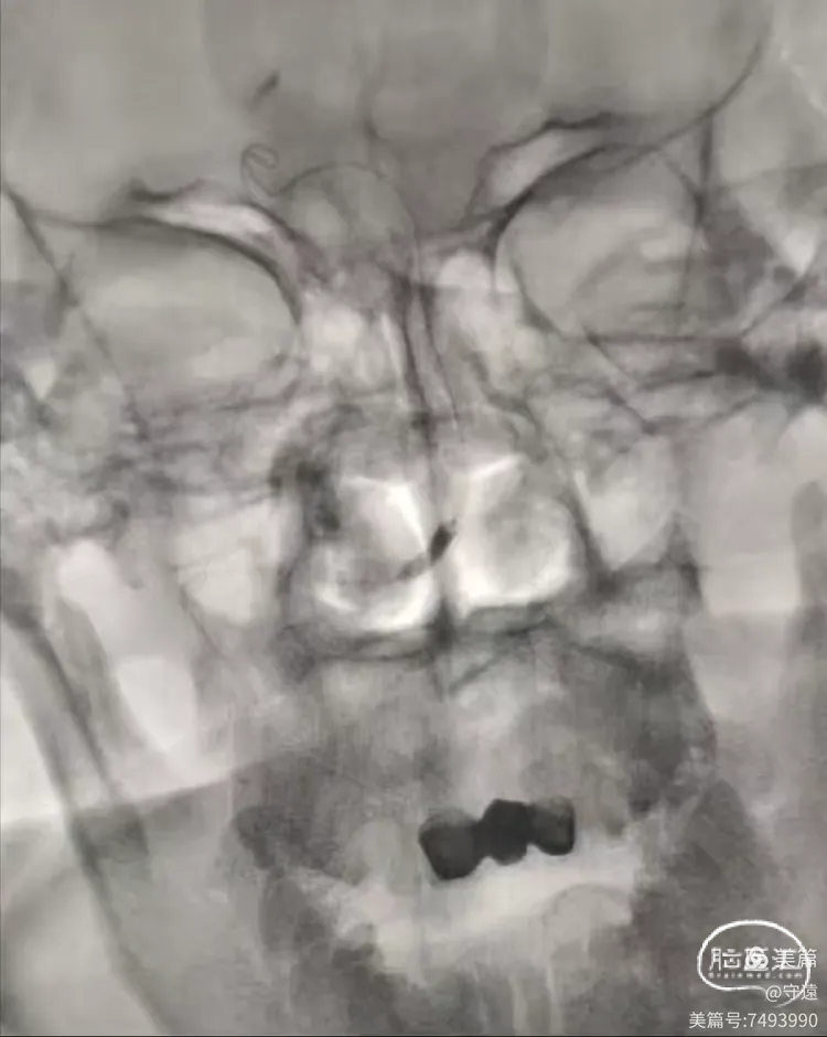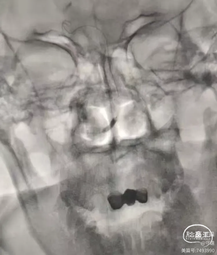 回撤至椎动脉起始段造影血流通畅,左侧大脑后似有少量血栓逃逸,推注替罗非班10mL,结束手术。