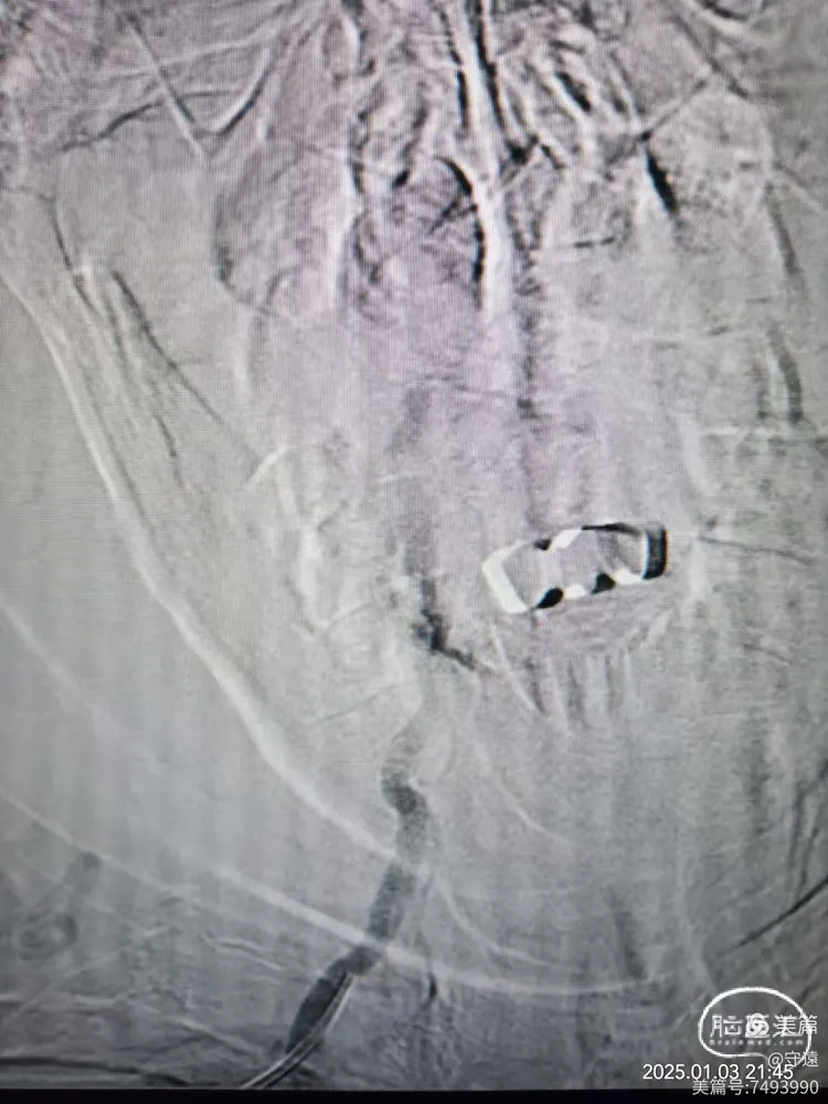 泥鳅导丝导引6FGT68血栓抽吸导管,泥鳅导丝不出头,内芯支持抽吸导管到达V3段。