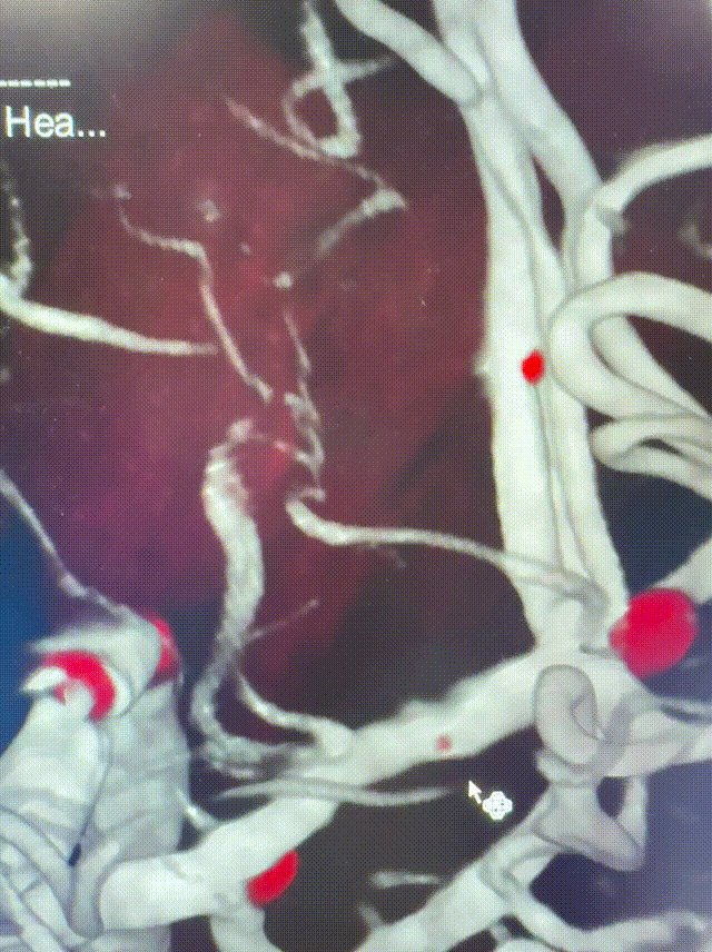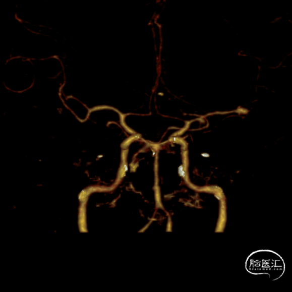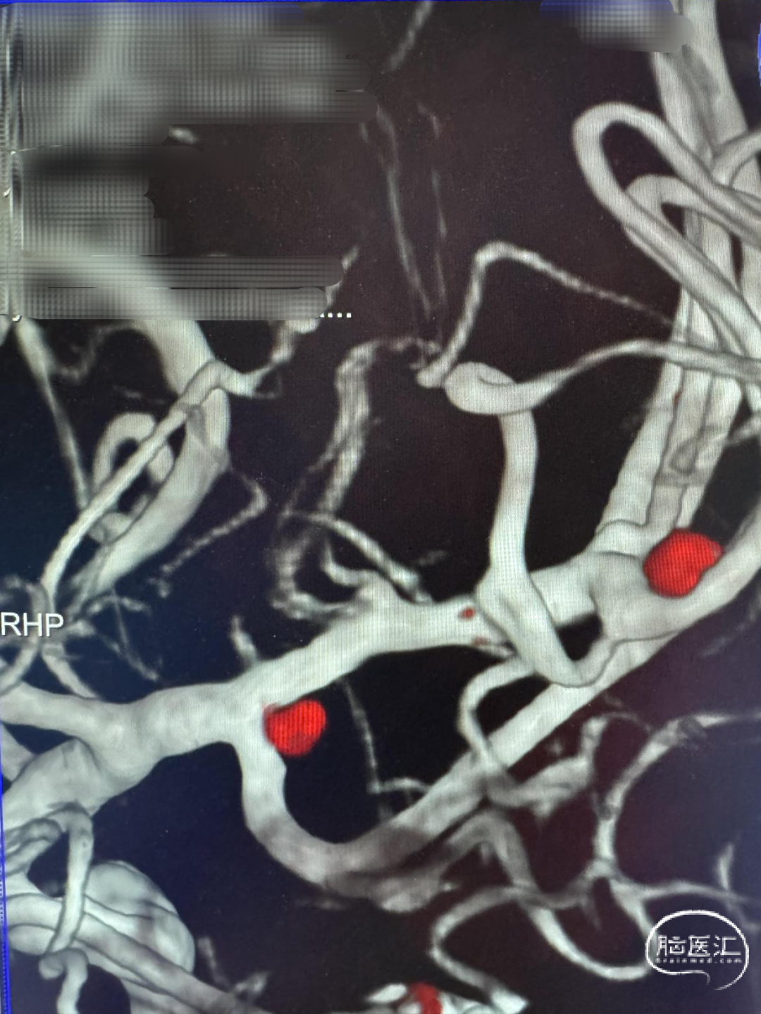 急诊头颅CTA:左侧大脑中动脉M1远端分叉处动脉瘤,左侧大脑中动脉M1段颞干分叉处动脉瘤。