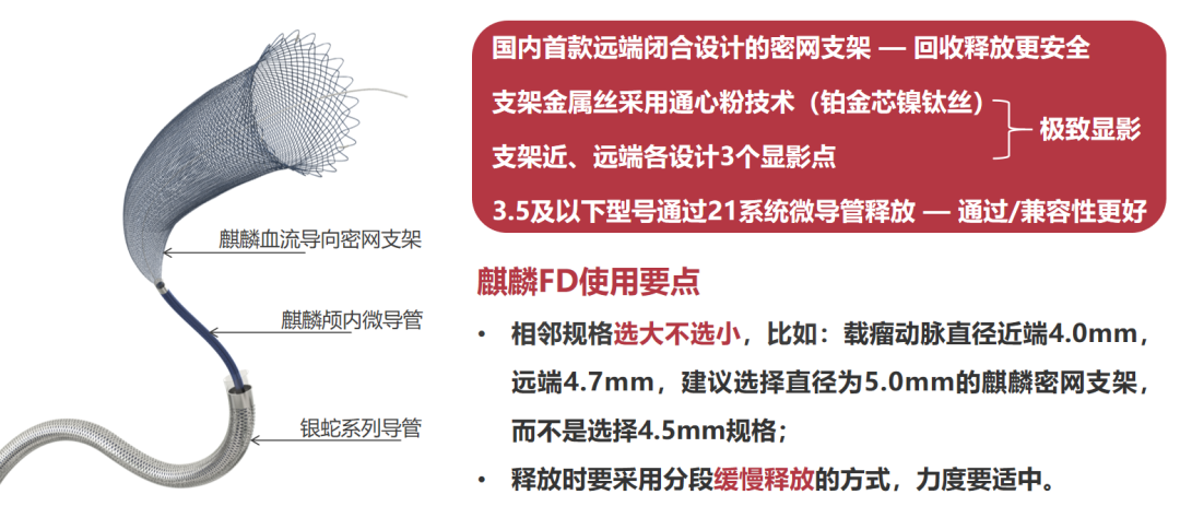 血流导向密网支架的出现为颅内动脉瘤传统的瘤内栓塞提供了新的理念,治疗策略转至重建载瘤动脉并促进动脉瘤的愈合。通桥麒麟FD是国内首款远端闭合设计的密网支架,由铂金芯镍钛丝编织而成,通体显影,近远端各3个显影点,3.5mm及以下直径规格可通过21系列微导管释放。为临床治疗颅内动脉瘤提供新的方案。