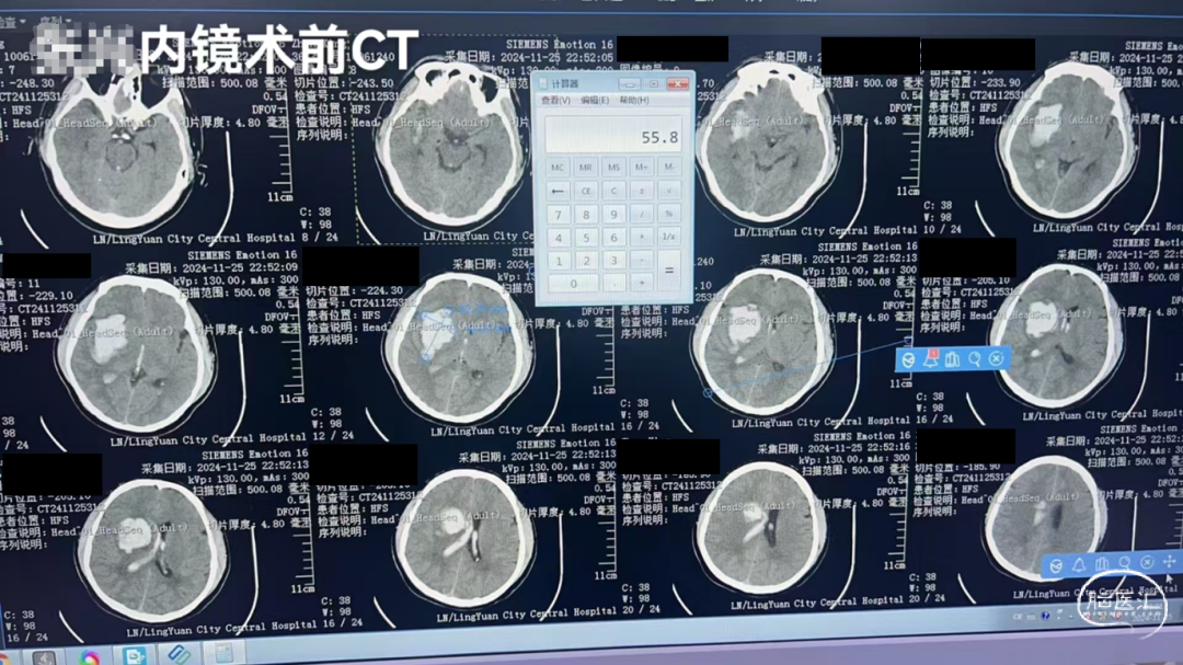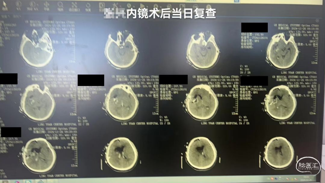 按照预定手术路径右颞叶中回皮质造瘘,在可视化下穿刺,达到血肿,固定套管,拔除可视化内镜,经导管套筒联合内镜可视化下清除血肿约50ml,冲洗流体膜,温盐水,观察血肿周围无活动出血,逐渐外拔套筒,术腔及套筒路径创面覆盖速即纱,再次冲洗未见活动出血。