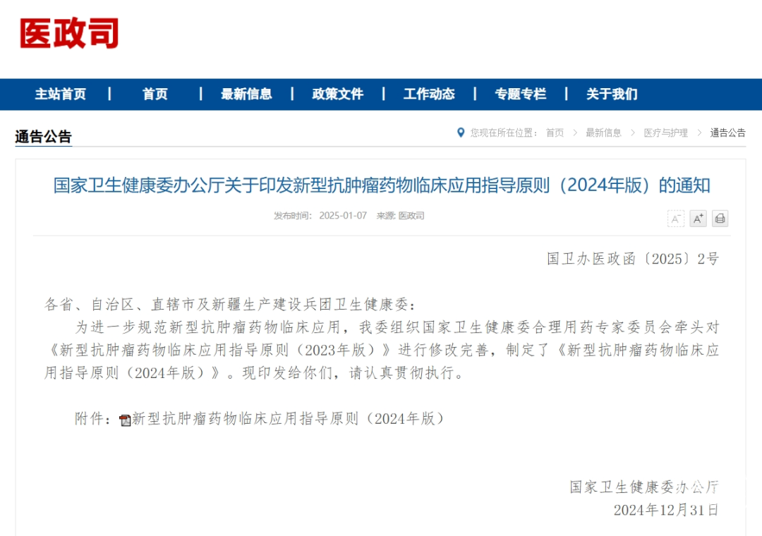 1月7日,国家卫生健康委发布《新型抗肿瘤药物临床应用指导原则(2024年版)》,进一步规范新型抗肿瘤药物临床应用。
