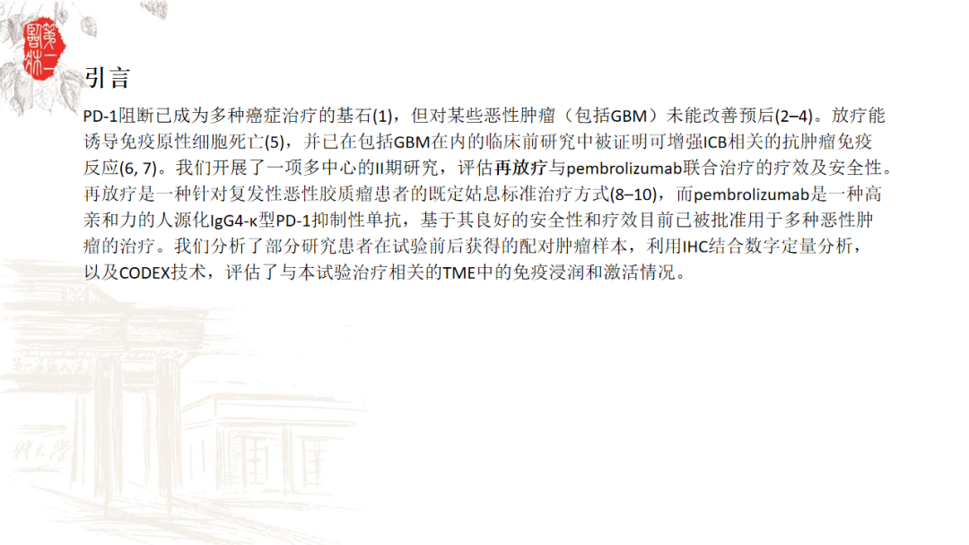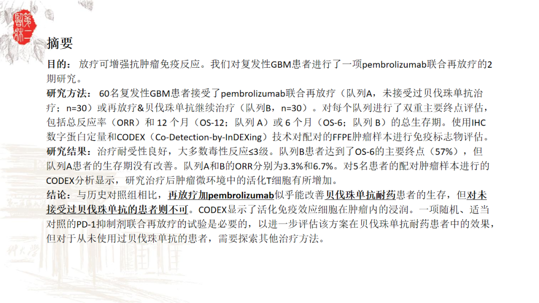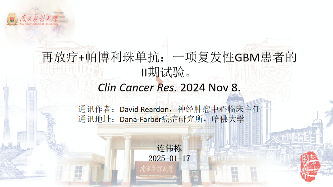 南方医科大学珠江医院神经肿瘤外科连伟栋医师带来的再放疗+帕博利珠单抗:一项复发性GBM患者的II期试验。欢迎阅读、分享!
