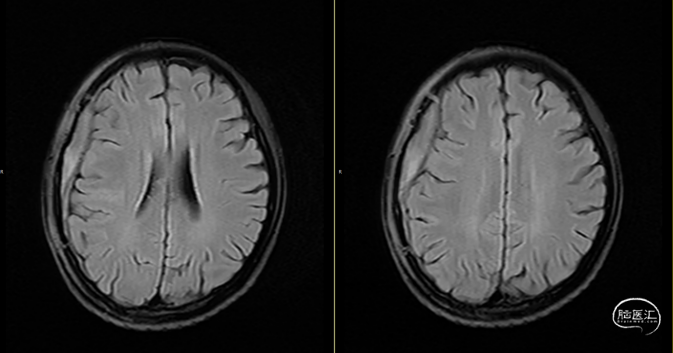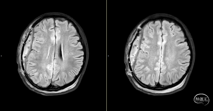 术后58天颅脑磁共振平扫(如上图):右侧额顶颞部见斑片状异常信号,呈片状T1WI低、T2WI稍高信号影,T2FLAIR呈稍高信号,边界清,右侧额顶颞叶脑组织受压,DWI(b=1000)呈混杂高信号,相应ADC呈混杂高信号影。