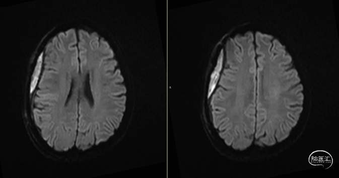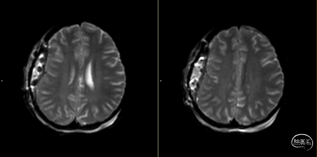 第2次术后12天,仍有间断头痛,刀口愈合可,复查颅脑MRI(如上图):右侧额顶颞部软组织稍增厚,右侧额顶部颅板下见条片状长T1、长T2信号,T2FLAIR呈稍高信号,边界清,DWI(b=1000)呈混杂高信号,相应ADC呈混杂高信号影,加用美罗培南联合万古霉素抗炎治疗。