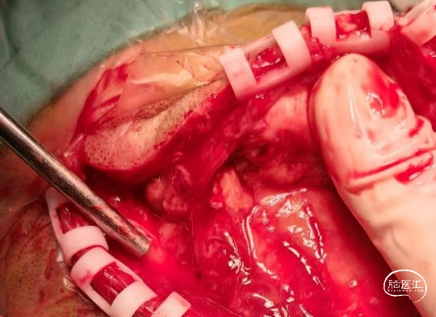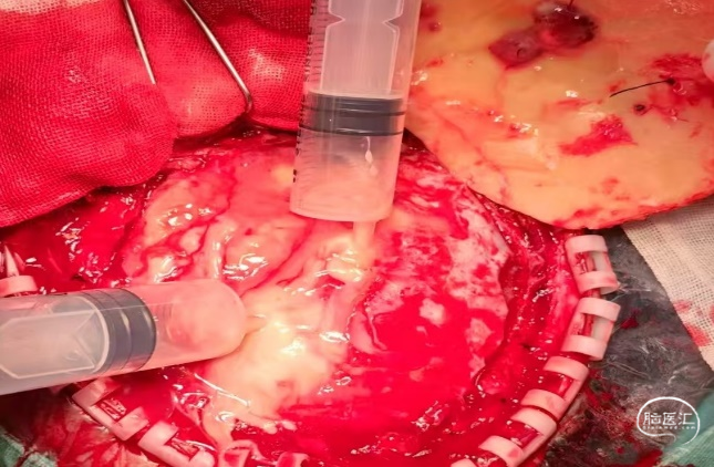 第2次手术后第17天,行颅脑CT检查(如上图),科室讨论仍建议去骨瓣清创,但患者情绪波动明显,拒绝去骨瓣;经协商后行硬膜外脓肿置管引流术。术中根据术前规划,切开颞顶部部分头皮,高速磨钻经骨缘与骨瓣之间磨出骨孔及骨槽,可见骨缘硬脑膜增生,深部硬膜增厚,并伴有灰黄色粘稠脓性液体流出,无明显异味,使用无菌注射器收集脓液约7ml,备细菌培养等检查;置引流管于硬膜外,骨瓣下,反复使用温生理盐水冲洗至水清晰,接负压吸引,及引流袋;术后继续使用万古霉素及美罗培南联合抗炎治疗。术后每日使用万古霉素溶液冲洗硬膜外腔1次。
