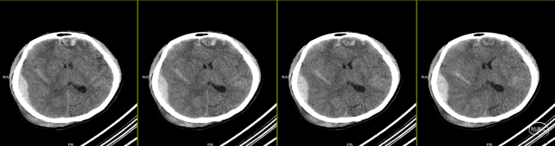 查体:嗜睡-昏睡状态,精神差,刺激睁眼,简单应答,肢体活动简单从嘱。GCS13分。双侧瞳孔等大等圆,直径2.5mm,对光反射灵敏,伸舌欠合作。转头、耸肩欠合作,四肢肌力4级,肌张力正常,颈抵抗(+),双Babinski sign未引出。枕部可见约5*4cm皮下血肿,压痛,拒按。周身多发片状皮肤擦伤。颅脑CT:双侧额叶脑挫裂伤;右侧顶颞枕部硬膜外、硬膜下血肿;蛛网膜下腔出血;右侧颞骨骨折累及右侧人字缝、顶乳缝,右侧顶乳缝旁小骨片;头皮软组织损伤、局部皮下血肿;双肺挫伤可能。