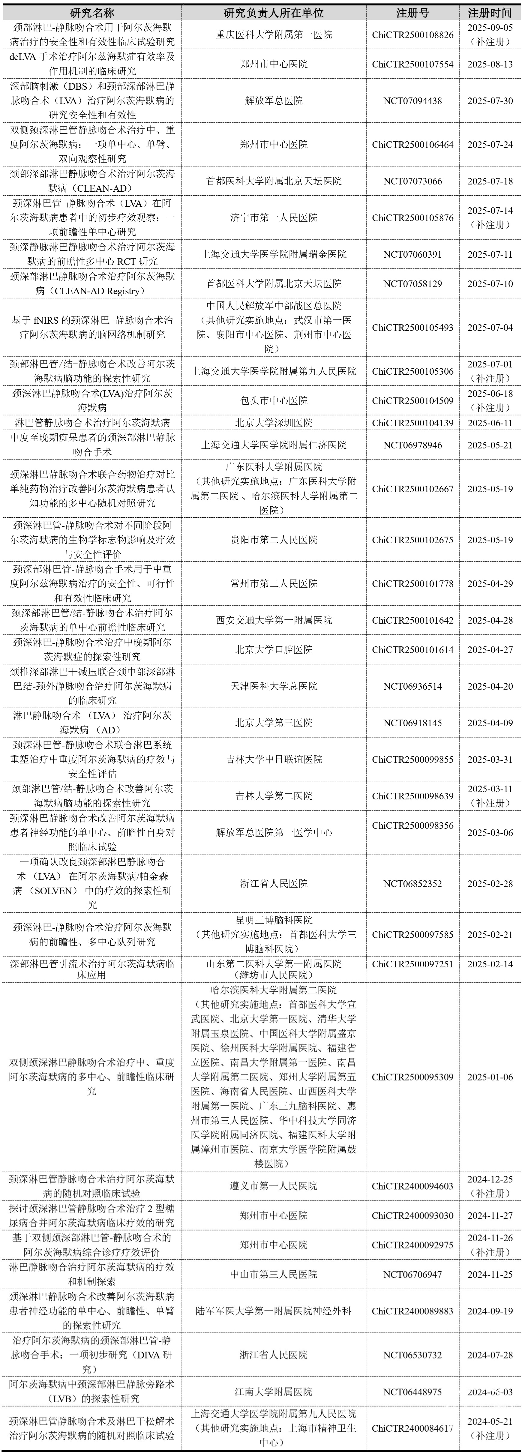 自2020年以来,国内多家医院已开展该手术,这一探索无疑给阿尔茨海默病治疗带来了新希望。尽管如此,相关实践的效果还仅限于个案报道或单中心的回顾性研究。以下是截至目前关于“颈深淋巴管-静脉吻合术”治疗阿尔茨海默病的注册临床试验(中国大陆),期待不久的将来,可以为这一术式的临床应用带来更多高质量的循证医学证据: